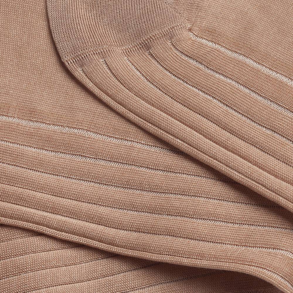 Модель бежевого цвета в рубчик с эффектом Shadow stripe. Тонкая двухцветная структура придает изделию элегантный вид, а контрастные полосы кремового оттенка эффектно проявляются при натяжении. При таком дизайне второй цвет остается в тени основного, создавая благородную игру тонов в динамике. Тонкая текстура полотна достигнута благодаря использованию высококачественного фильдекосового хлопка Fil d'Écosse. Плотность вязки в 200 игл, двойная мерсеризация и опаливание волокон придают ткани шелковистый блеск и исключительную гладкость. Усиленные зоны в местах повышенного напряжения гарантируют долговечность, а выполненный вручную бесшовный мысок (Hand linked) полностью исключает давление в любой обуви.