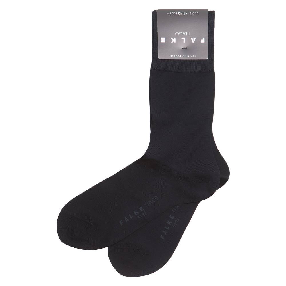 Носки Tiago тёмно-синего цвета немецкой фирмы Falke выполнены из высококачественного хлопка, а именно из фильдекоса, или шотландской нити (fil d’ecosse / cotton lisle) в сочетании с эластаном. Фильдекос – это туго скрученная хлопчатобумажная нить, созданная из лучших сортов хлопчатника. Носки из такого материала отличаются высокой прочностью и износостойкостью: они прекрасно держат форму и не портятся после стирок. Шов на мысе выполнен вручную, а не на машинке, поэтому он мягкий и гладкий. В области стопы имеется дополнительный слой хлопковой ткани, что создает усиление зон нагрузки. Удлиненная манжета обеспечивает посадку на ноге без складок.