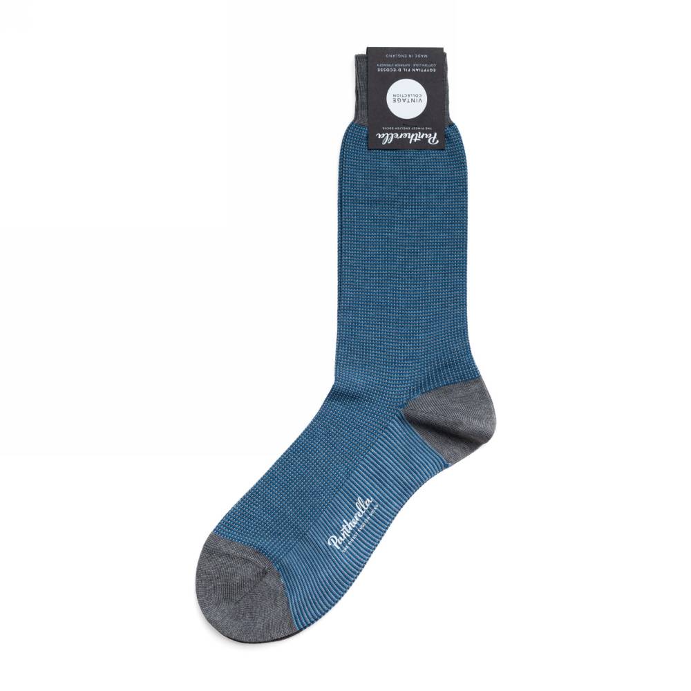 Модель имеет сдержанный узор «птичий глаз» в серых, синих и голубых тонах. Данные носки можно сочетать как с повседневной обувью, джинсами и брюками чинос, так и с умеренно деловыми туфлями и костюмами.