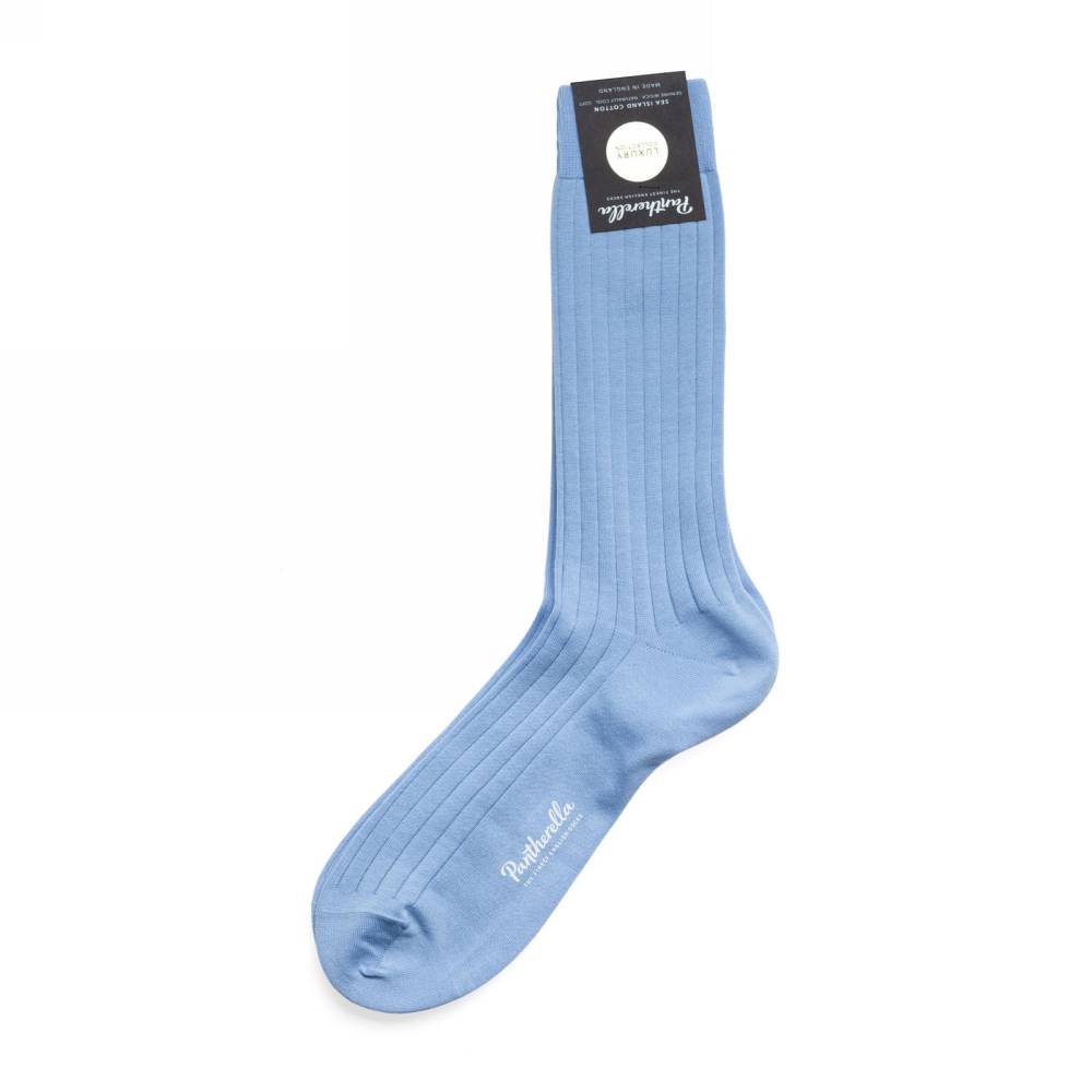 Голубые мужские носки Pembrey — это носки премиум-класса английской компании Pantherella из коллекции Luxury. Пара выполнена с соблюдением высочайших стандартов качества, которых фабрика придерживается начиная с даты своего основания в 1937 году. Пряжа изготовлена из хлопка Sea Island, который выращивают лишь на Барбадосе и Ямайке. Собранный хлопок проходит тщательную очистку, а затем специальная организация — West Indian Sea Island Cotton Association — определяет, сертифицировать ли сырьё как хлопок Sea Island. По прочности этот материал сопоставим с шёлком, а мягкостью напоминает кашемир. В Англии на фабрике Pantherella на станках с 200 иглами и применением ручного труда пряжа превращается в готовое изделие. Особенностью носков можно отметить гладкий и практически неощущаемый шов на носке.