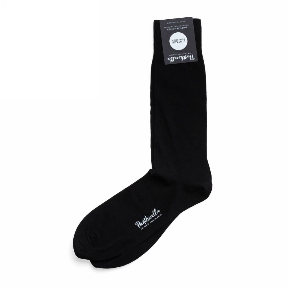 Чёрные мужские носки премиум-класса английской компании Pantherella из коллекции Vintage. Пара выполнена с соблюдением высочайших стандартов качества, которых фабрика придерживается начиная с даты своего основания в 1937 году. Создание данной пары начинается со сбора и обработки длинноволокнистого хлопка в дельте реки Нил (Египет). Затем уже в Италии из него производят пряжу. В Англии на фабрике Pantherella на станках с 200 иглами и применение Особенностью носков можно отметить гладкий и практически неощущаемый шов на носке.