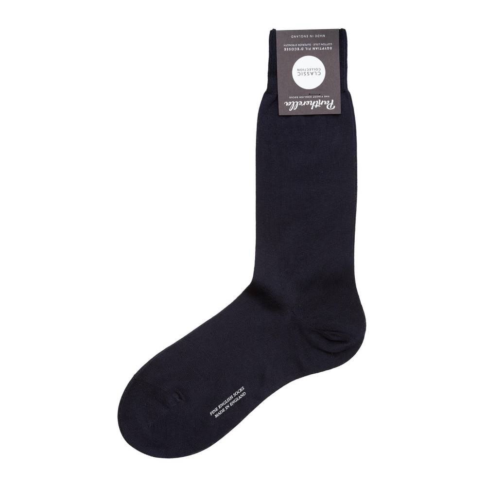 Тёмно-синие мужские носки Sackville — это носки премиум-класса английской компании Pantherella из коллекции Classic. Пара выполнена с соблюдением высочайших стандартов качества, которых фабрика придерживается начиная с даты своего основания в 1937 году. Создание данной пары начинается со сбора и обработки длинноволокнистого хлопка Giza 88 в дельте реки Нил (Египет). Затем уже в Италии из него производят фильдекосовую пряжу. В процессе мерсеризации с пряжи удаляются все свободные волокна, благодаря чему она становится гладкой и блестящей. В Англии на фабрике Pantherella на станках с 200 иглами и применением ручного труда пряжа превращается в готовое изделие. Особенностью носков можно отметить гладкий и практически неощущаемый шов на носке.