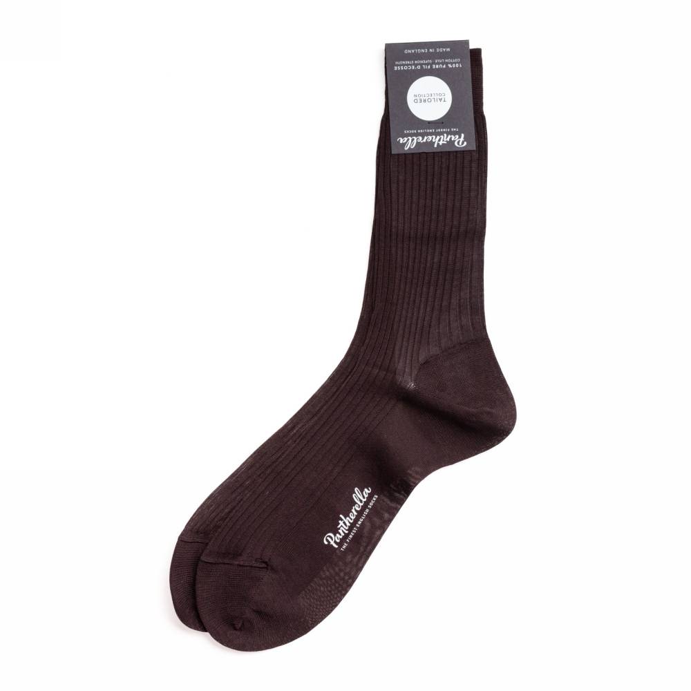 Тёмно-коричневые мужские носки Vale — это носки премиум-класса английской компании Pantherella из коллекции Tailored. Пара выполнена с соблюдением высочайших стандартов качества, которых фабрика придерживается начиная с даты своего основания в 1937 году. Создание данной пары начинается со сбора и обработки длинноволокнистого хлопка Giza 88 в дельте реки Нил (Египет). Затем уже в Италии из него производят фильдекосовую пряжу. В процессе мерсеризации с пряжи удаляются все свободные волокна, благодаря чему она становится гладкой и блестящей. В Англии на фабрике Pantherella на станках с 200 иглами и применением ручного труда пряжа превращается в готовое изделие. Особенностью носков можно отметить гладкий и практически неощущаемый шов на носке.