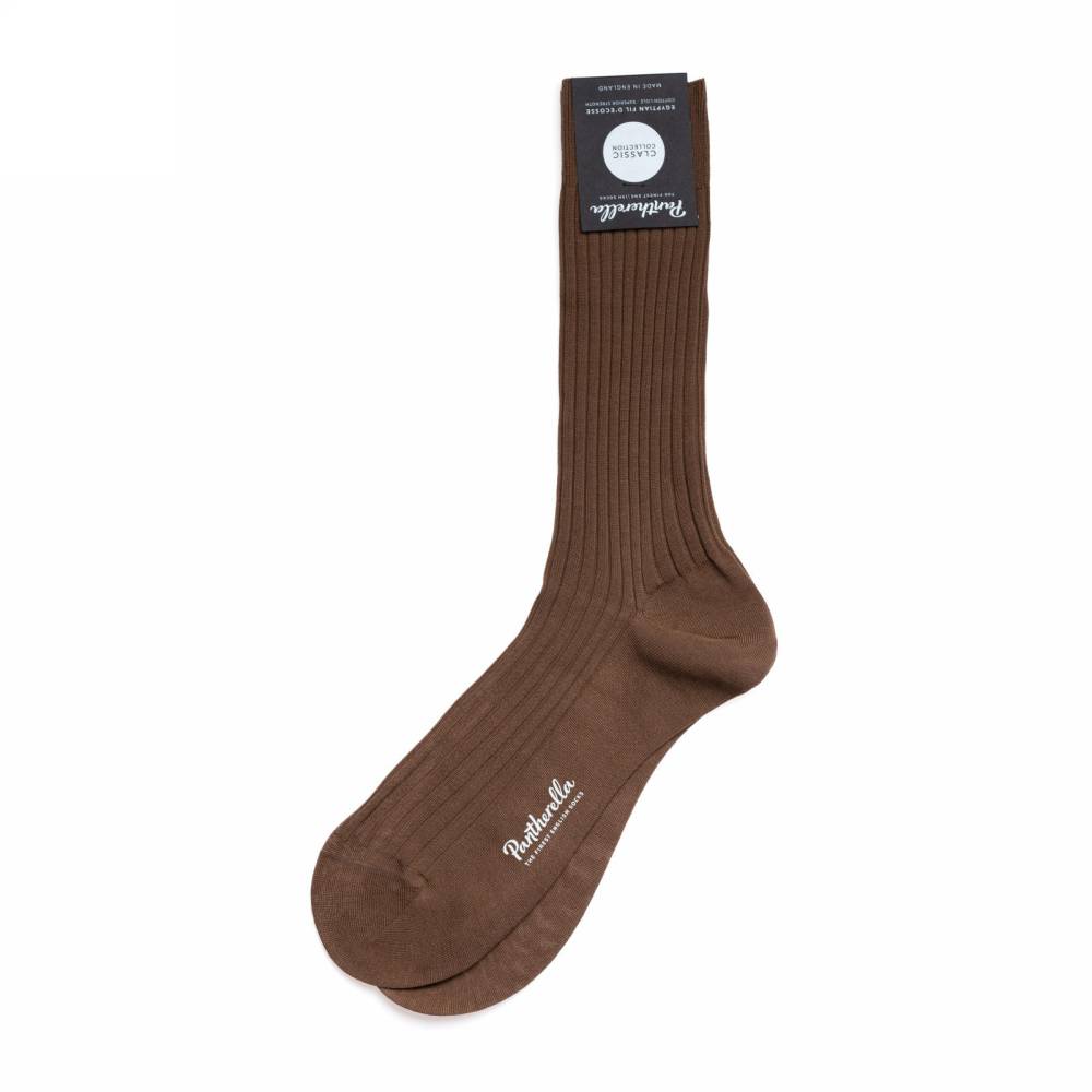 Коричневые мужские носки Danvers — это носки премиум-класса английской компании Pantherella из коллекции Classic. Пара выполнена с соблюдением высочайших стандартов качества, которых фабрика придерживается начиная с даты своего основания в 1937 году. Создание данной пары начинается со сбора и обработки длинноволокнистого хлопка Giza 88 в дельте реки Нил (Египет). Затем уже в Италии из него производят фильдекосовую пряжу. В процессе мерсеризации с пряжи удаляются все свободные волокна, благодаря чему она становится гладкой и блестящей. В Англии на фабрике Pantherella на станках с 200 иглами и применением ручного труда пряжа превращается в готовое изделие. Особенностью носков можно отметить гладкий и практически неощущаемый шов на носке.