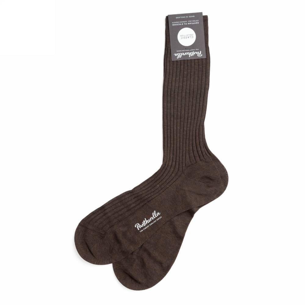 Хлопковые мужские носки Danvers тёмно-коричневого цвета — это носки премиум-класса английской компании Pantherella из коллекции Classic. Пара выполнена с соблюдением высочайших стандартов качества, которых фабрика придерживается начиная с даты своего основания в 1937 году. Создание данной пары начинается со сбора и обработки длинноволокнистого хлопка Giza 88 в дельте реки Нил (Египет). Затем уже в Италии из него производят фильдекосовую пряжу. В процессе мерсеризации с пряжи удаляются все свободные волокна, благодаря чему она становится гладкой и блестящей. В Англии на фабрике Pantherella на станках с 200 иглами и применением ручного труда пряжа превращается в готовое изделие. Особенностью носков можно отметить гладкий и практически неощущаемый шов на носке.