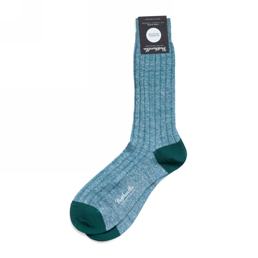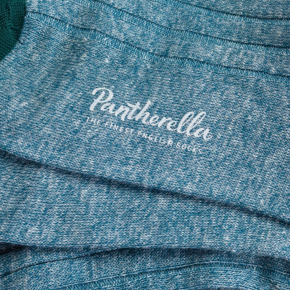Лёгкие летние носки Hamada английского бренда Pantherella из базовой линейки Classic collection. Модель была названа в честь пустынной местности под жарким палящим солнцем, где природа диктует свои условия, заставляя использовать определенные виды одежды и ткани. Носки Hamada выполнены из высококачественной смесовой пряжи, в состав которой входят лён и хлопок. Благодаря этому стопа чувствует себя комфортно в классической обуви в жаркую погоду. Модель имеет приятный меланжевый голубой цвет с контрастными тёмно-зелёными частями на пятке и мыске. Пара выполнена с соблюдением высочайших стандартов качества, которых фабрика придерживается начиная с даты своего основания в 1937 году. Особенностью носков является гладкий и практически неощущаемый шов на мыске, что является фирменной чертой бренда.