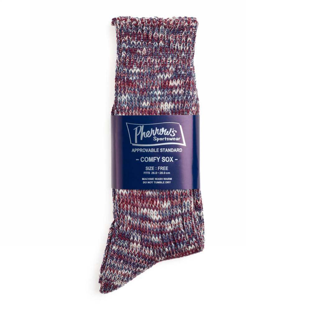 Comfy — тёплые объёмные носки Pherrow's крупной вязки. Стилистической особенностью модели является толстая хлопковая пряжа бордовых, фиолетовых, синих и белых оттенков. Её также отличает ярко выраженная фактура.