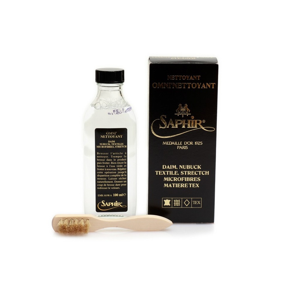 Очиститель Omni' Nettoyant из премиальной линии Saphir Medaille d'Or 1925 разработан для глубокой очистки и разрыхления замши, нубука и текстиля. Его поверхностно-активная формула на основе растворителя эффективно воздействует на пятна и грязь, проникая глубоко и удаляя даже самые стойкие примеси. В комплект входит деревянная щетка с натуральной щетиной для бережной очистки без повреждения поверхности.