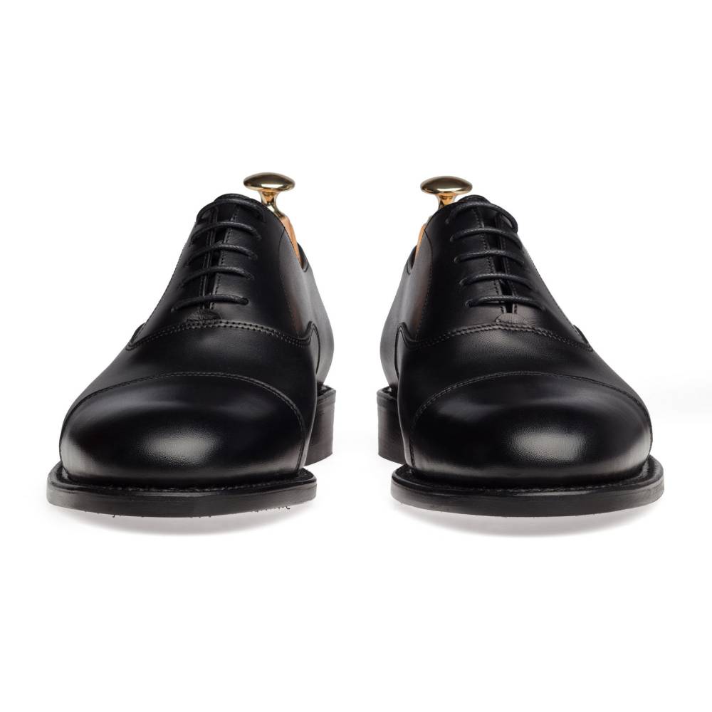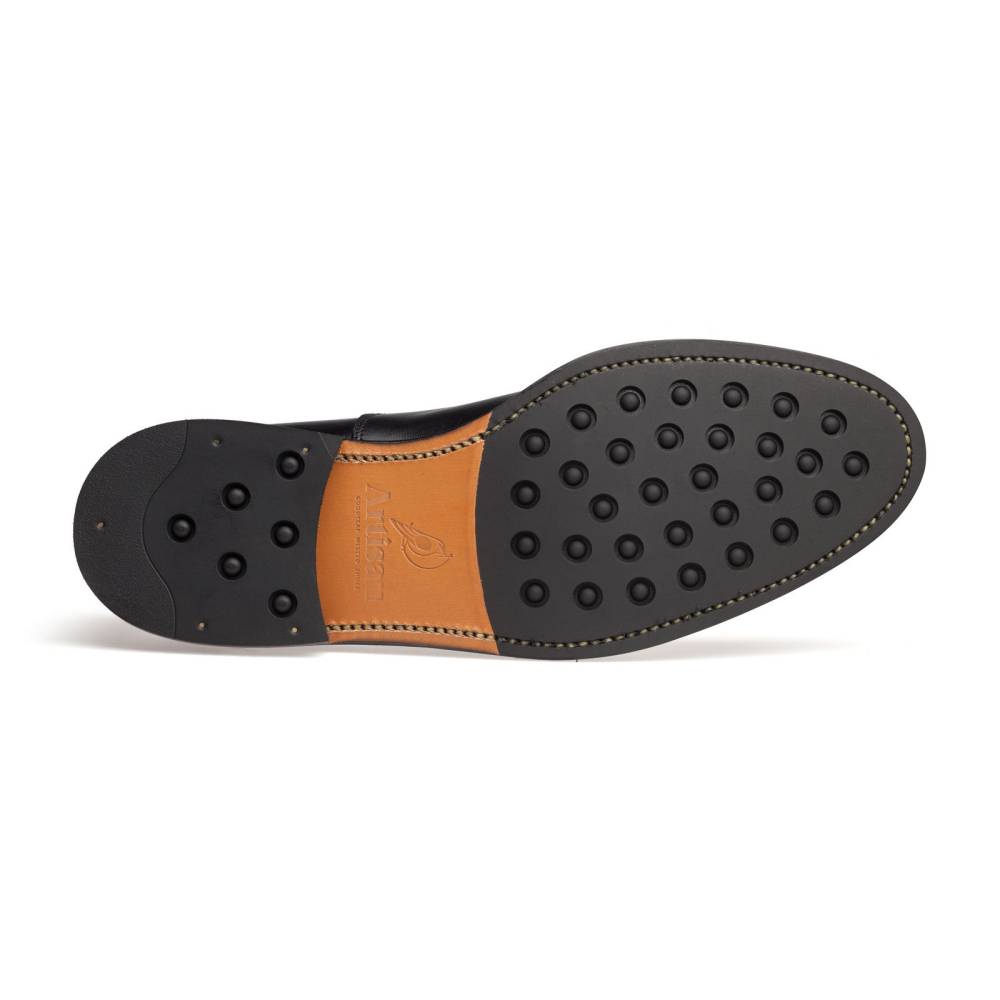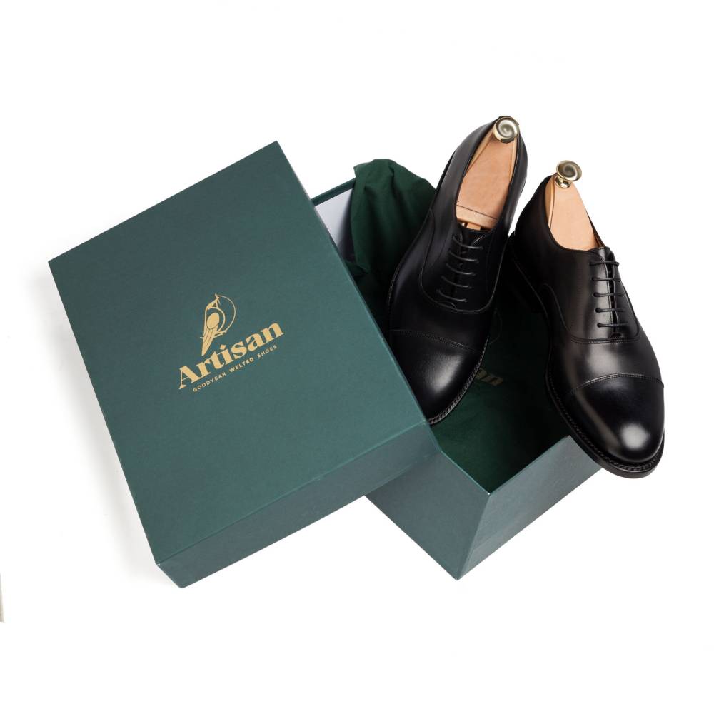 Традиционная модель «оксфорд» чёрного цвета от испанского бренда Artisan. Подходит для формальных и торжественных мероприятий в сочетании со смокингами и тёмно-синими костюмами. Верх выполнен из гладкой телячьей кожи. Внутри цельная стелька из тонкой мягкой кожи. Практичная подошва из кожи и резины. Все строчки верха и швы ранта выполнены с особой аккуратностью, согласно философии бренда. Конструкция Goodyear Welted.