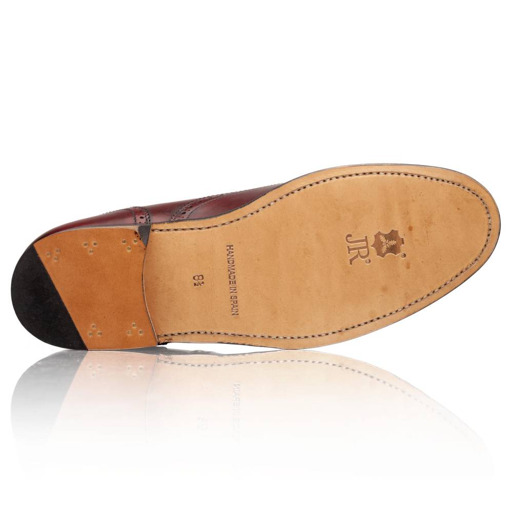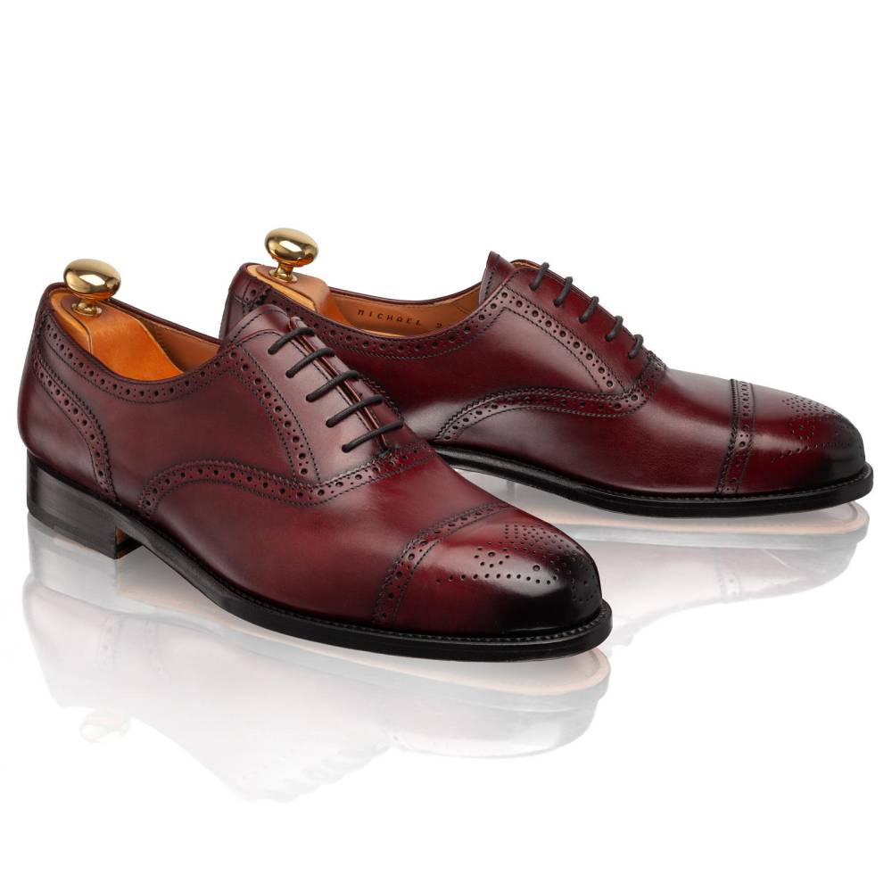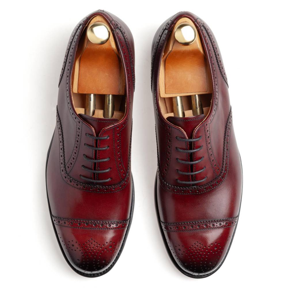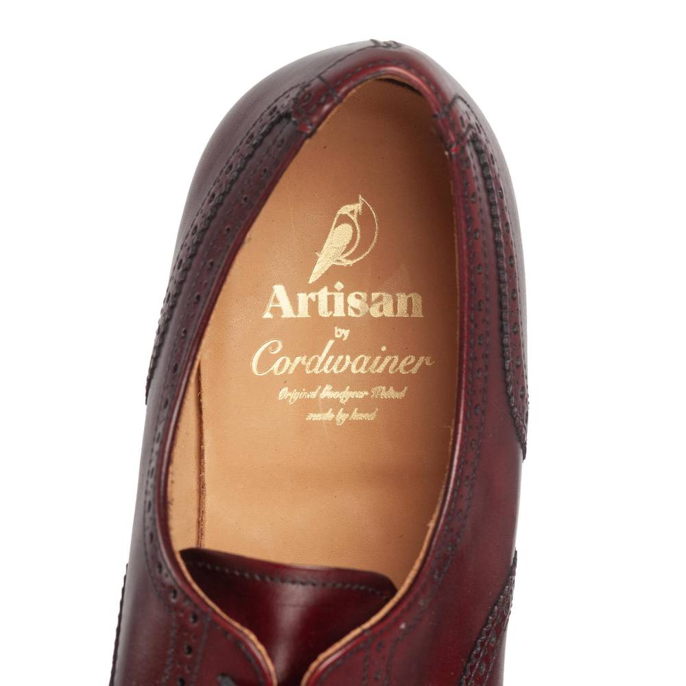 Классические мужские туфли-оксфорды бренда Artisan из гладкой телячьей кожи бордового цвета. Модель изготовлена по специальному заказу на испанской фабрике Cordwainer в городе Альманса – центре обувной промышленности Испании. Для верха была выбрана кожа Elba, которая является визитной карточкой Cordwainer. Поверхность кожи тонируется вручную, а затем полируется. Благодаря такой технике материал приобретает эффект патины с лёгкими затемнениями по бокам, на мыске и пятке. Внутренняя отделка из тонкой кожи. На данную пару установлена высококачественная кожаная подошва от знаменитой немецкой мануфактуры Joh. Rendenbach. Туфли украшены традиционным перфорированным узором и медальоном на мысе. Конструкция Goodyear Welted.