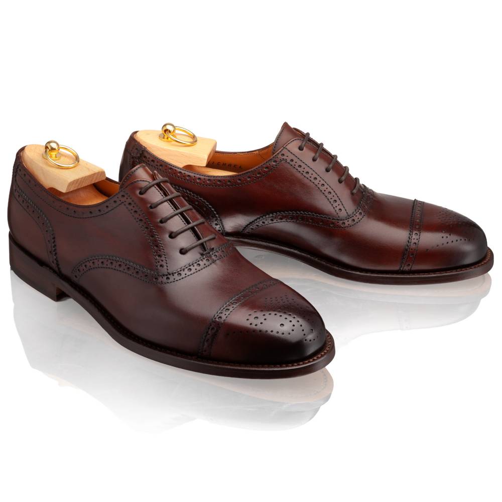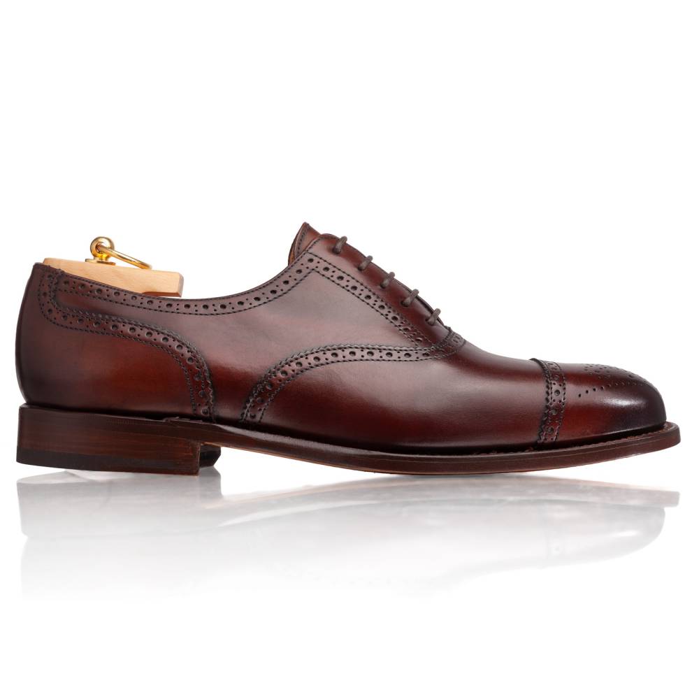 Классические мужские туфли-оксфорды бренда Artisan из гладкой телячьей кожи тёмно-коричневого цвета. Модель изготовлена по специальному заказу на испанской фабрике Cordwainer в городе Альманса – центре обувной промышленности Испании. Для верха была выбрана кожа Elba, которая является визитной карточкой Cordwainer. Поверхность кожи тонируется вручную, а затем полируется. Благодаря такой технике материал приобретает эффект патины с лёгкими затемнениями по бокам, на мыске и пятке. Внутренняя отделка из тонкой кожи. На данную пару установлена высококачественная кожаная подошва от знаменитой немецкой мануфактуры Joh. Rendenbach. Туфли украшены традиционным перфорированным узором и медальоном на мысе. Конструкция Goodyear Welted.