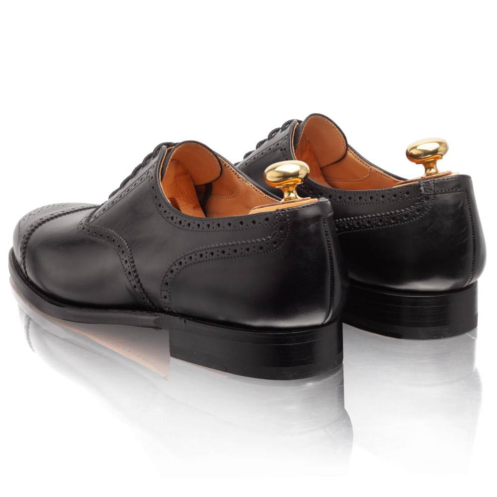 Классические мужские туфли-оксфорды бренда Artisan из гладкой телячьей кожи чёрного цвета. Модель изготовлена по специальному заказу на испанской фабрике Cordwainer в городе Альманса – центре обувной промышленности Испании. Внутренняя отделка из тонкой кожи. На данную пару установлена высококачественная кожаная подошва от знаменитой немецкой мануфактуры Joh. Rendenbach. Туфли украшены традиционным перфорированным узором и медальоном на мысе. Конструкция Goodyear Welted.