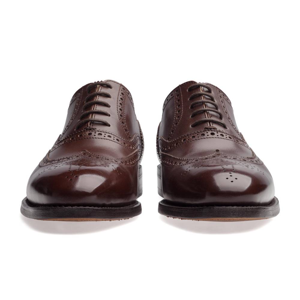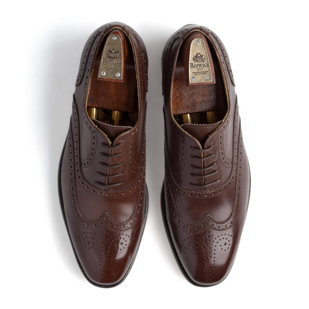 Оксфорды броги Berwick на кожаной подошве от знаменитой немецкой кожевенной мастерской Joh. Rendenbach. Верх модели выполнен из плотной телячьей кожи тёмно-коричневого цвета. Туфли украшены традиционным перфорированным узором и медальоном на мысе. Конструкция Goodyear Welted.