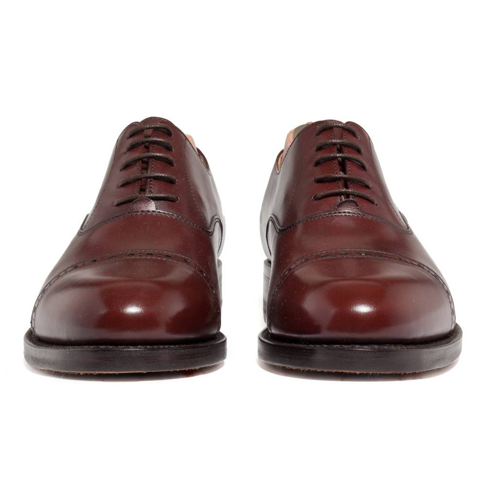 Классические туфли оксфорды Berwick выполнены из плотной седельной кожи тёмно-бордового оттенка с лёгким коричневым отливом. Данный вид кожи используется для производства лошадиных сёдел, поэтому обладает значительной износоустойчивостью и прочностью. Мыс декорирован перфорированным узором. На обувь установлена двухслойная кожаная подошва от знаменитой немецкой кожевенной мастерской Joh. Rendenbach. Внутренняя отделка из тонкой кожи горчичного оттенка. Конструкция Goodyear Welted.