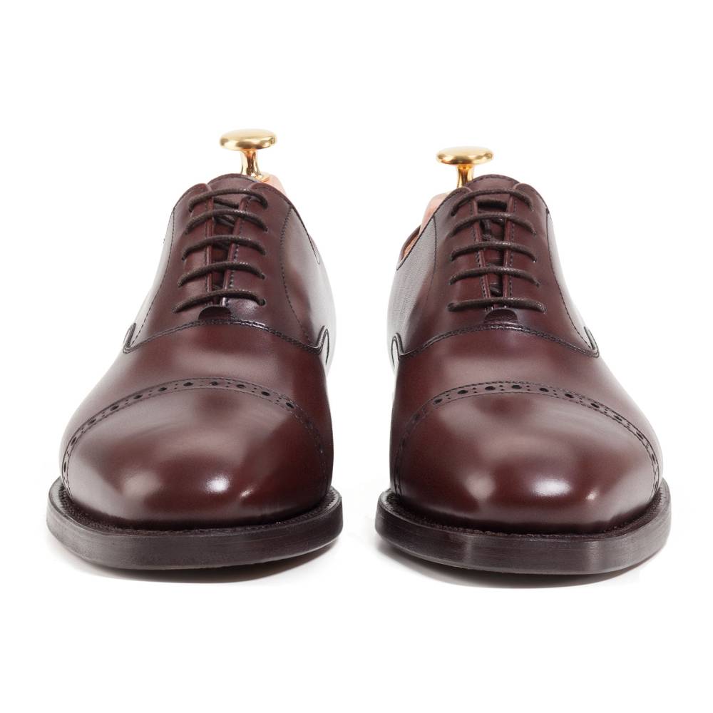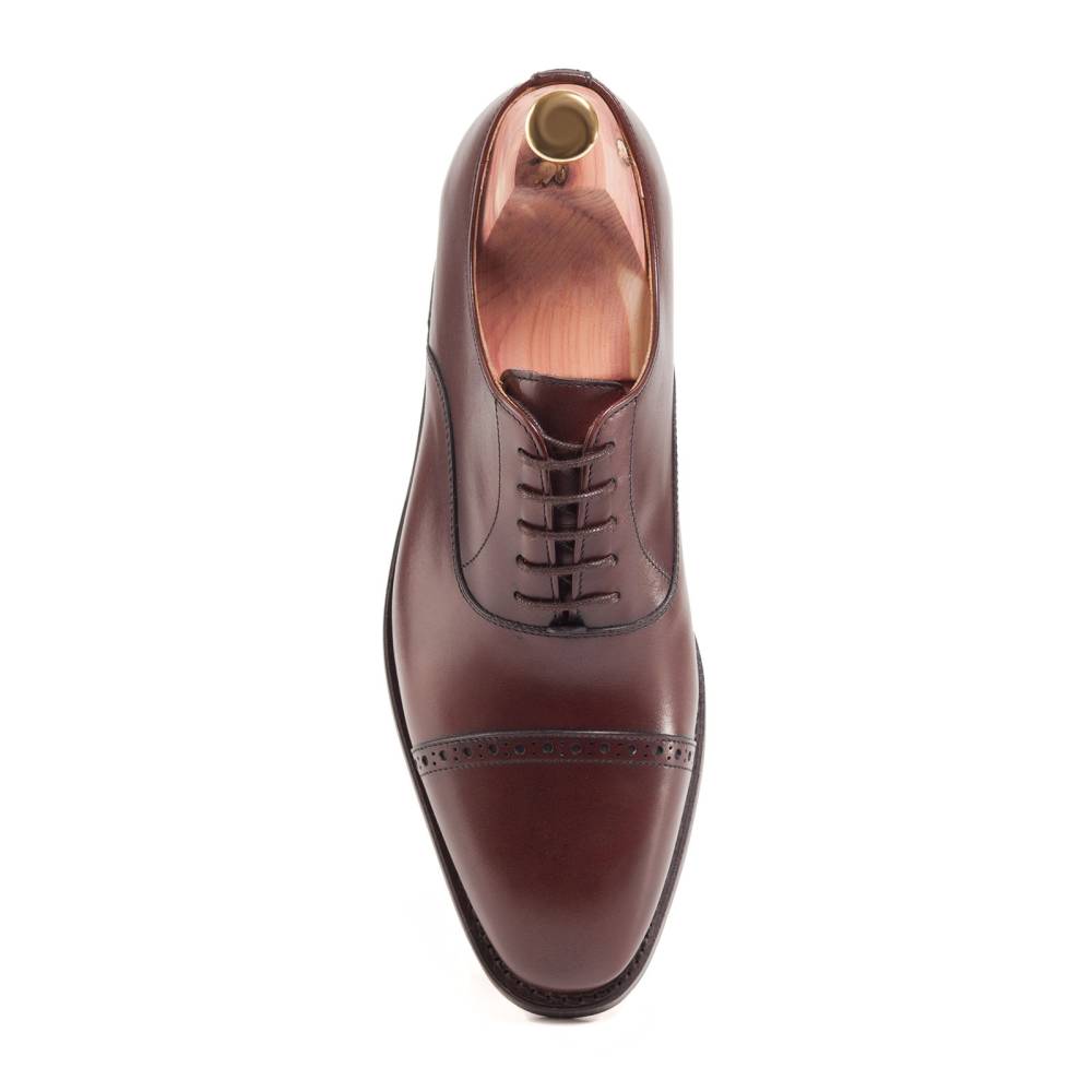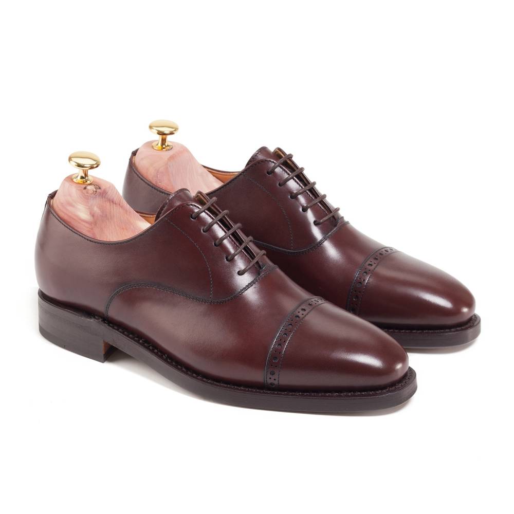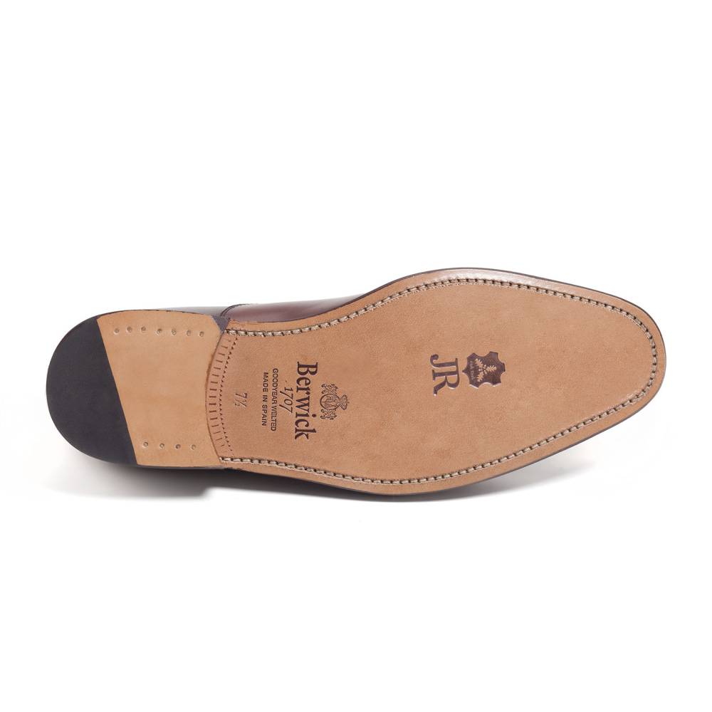 Классические туфли оксфорды Berwick выполнены из плотной седельной кожи тёмно-бордового оттенка. Данный вид кожи используется для производства лошадиных сёдел, поэтому обладает значительной износоустойчивостью и прочностью. Мыс декорирован перфорированным узором. На обувь установлена двухслойная кожаная подошва от знаменитой немецкой кожевенной мастерской Joh. Rendenbach. Внутренняя отделка из тонкой кожи горчичного оттенка. Конструкция Goodyear.