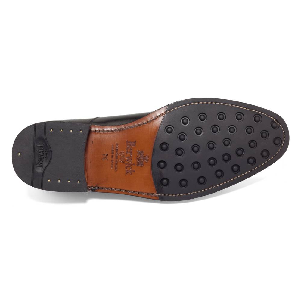 Туфли оксфорды Berwick на подошве из кожи и резины. Верх модели выполнен из плотной телячьей кожи. Мыс декорирован перфорированным узором. Внутренняя отделка из тонкой кожи горчичного оттенка. Конструкция Goodyear Welted.