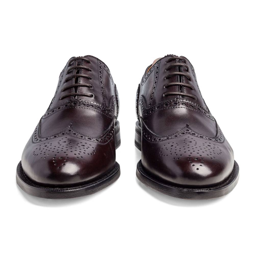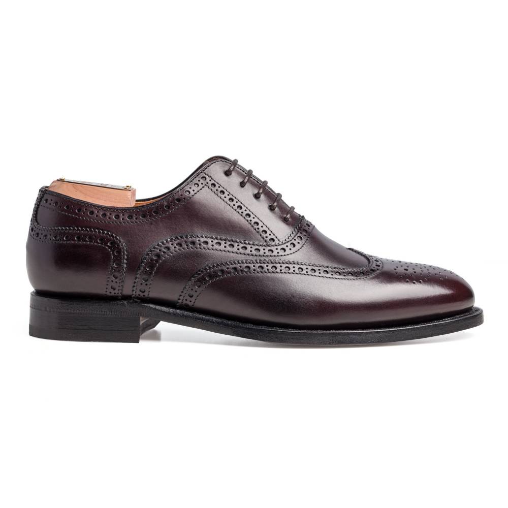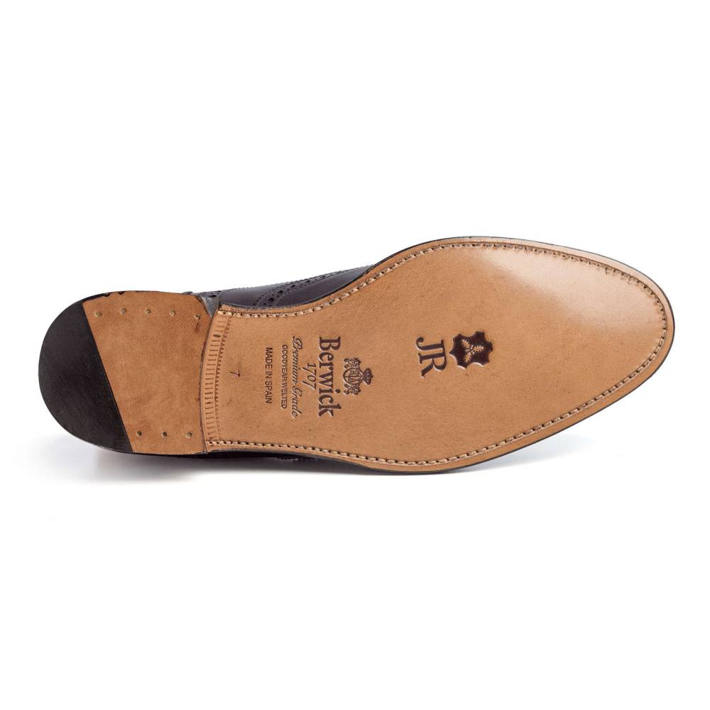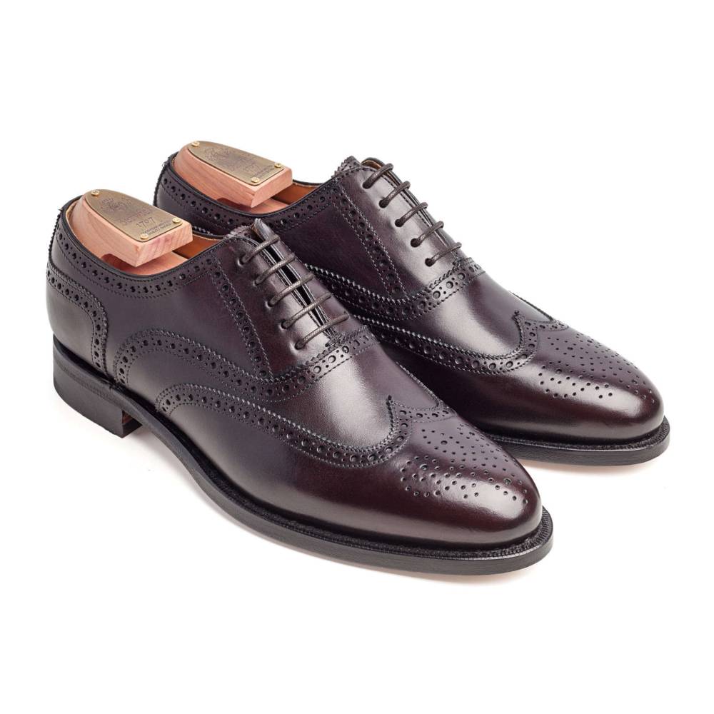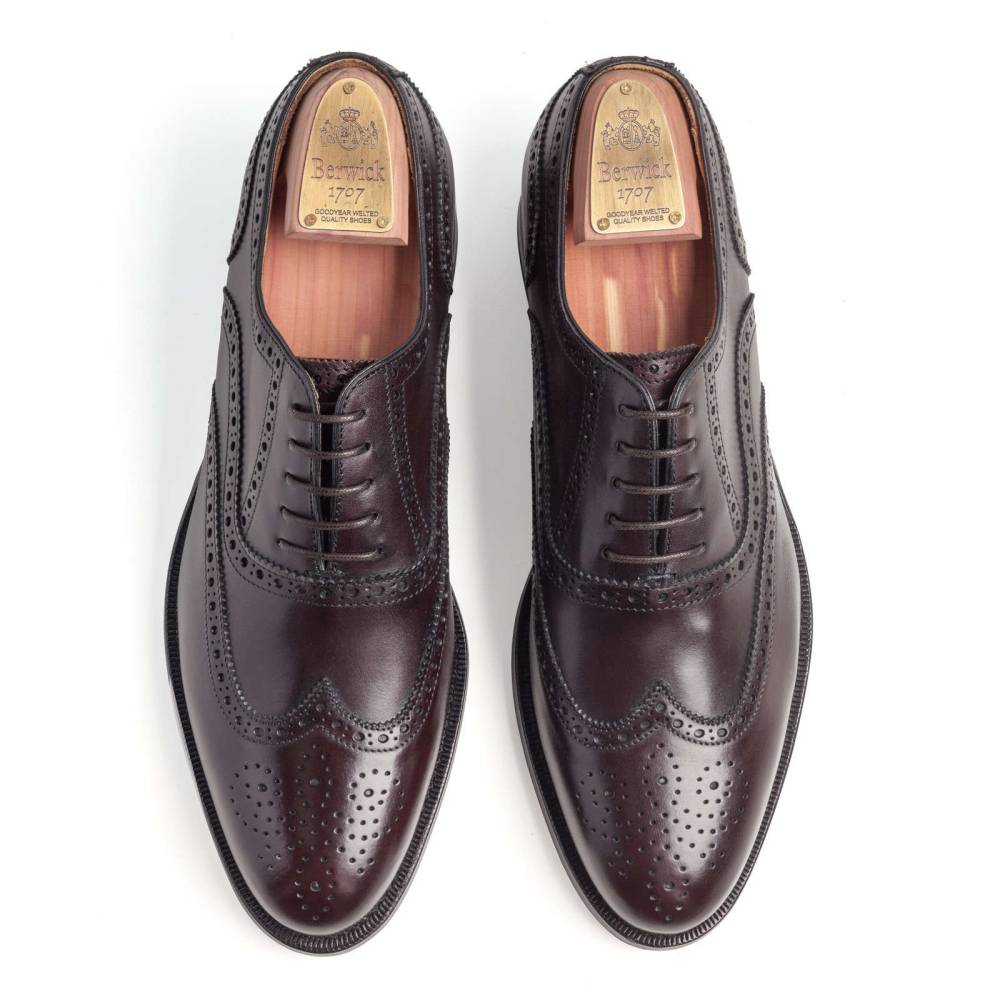 Оксфорды Berwick 1707 тёмно-бордового цвета из коллекции Premium Grade. На данную пару установлена высококачественная кожаная подошва от знаменитой немецкой кожевенной мастерской Joh. Rendenbach. Верх выполнен из плотной седельной кожи (saddle calf leather). Данный вид кожи используется для производства лошадиных сёдел, поэтому обладает значительной износоустойчивостью и прочностью. Туфли украшены традиционным перфорированным узором и медальоном на мысе. Конструкция Goodyear Welted.