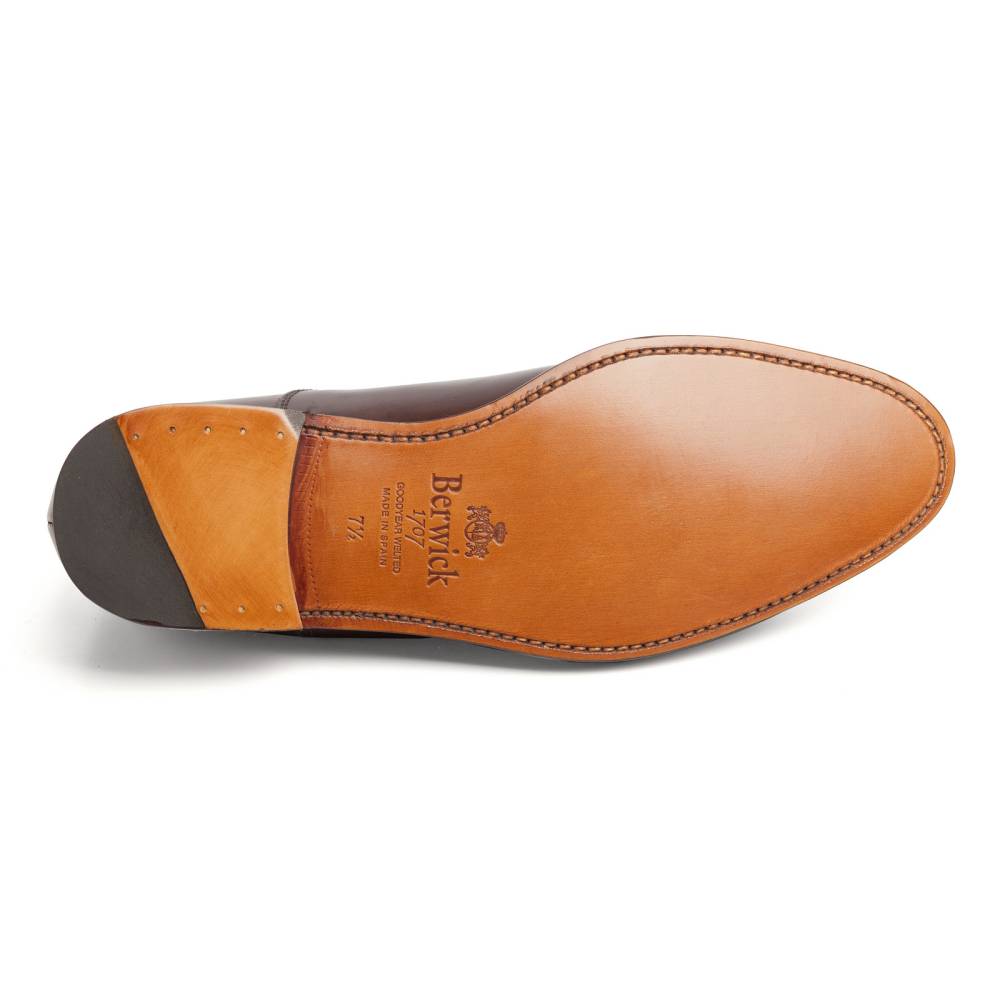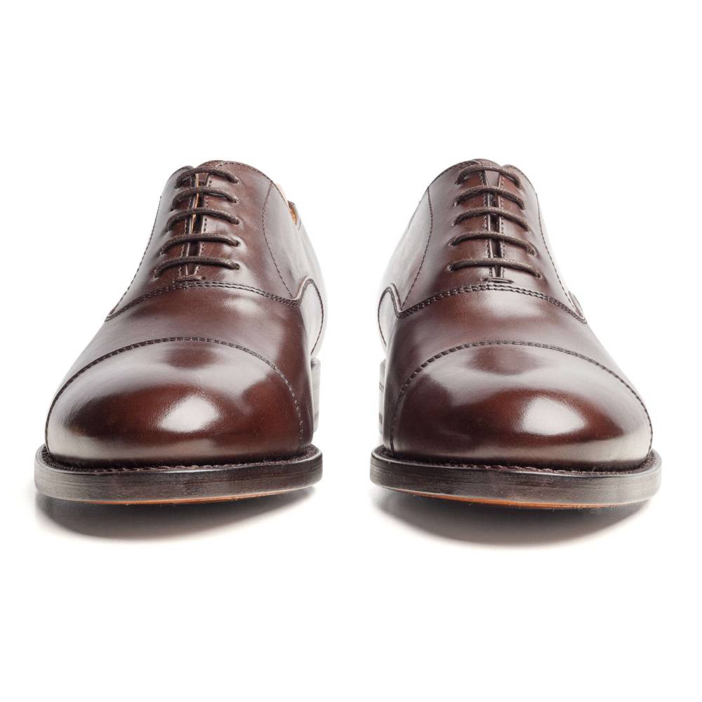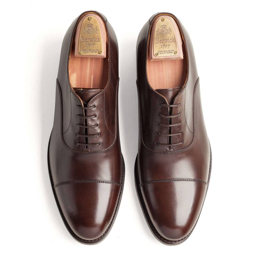 Традиционные оксфорды c отрезным мысом из коллекции испанского бренда Berwick. Верх выполнен из плотной телячьей кожи тёмно-коричневого цвета. Кожаная подошва. Конструкция Goodyear Welted.