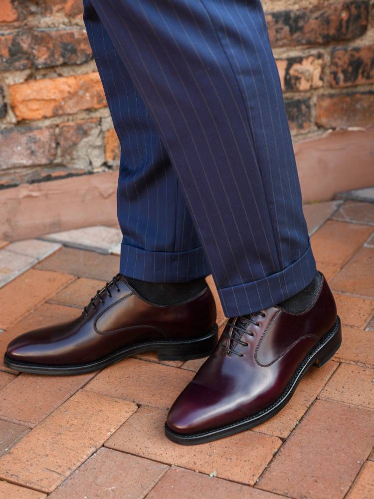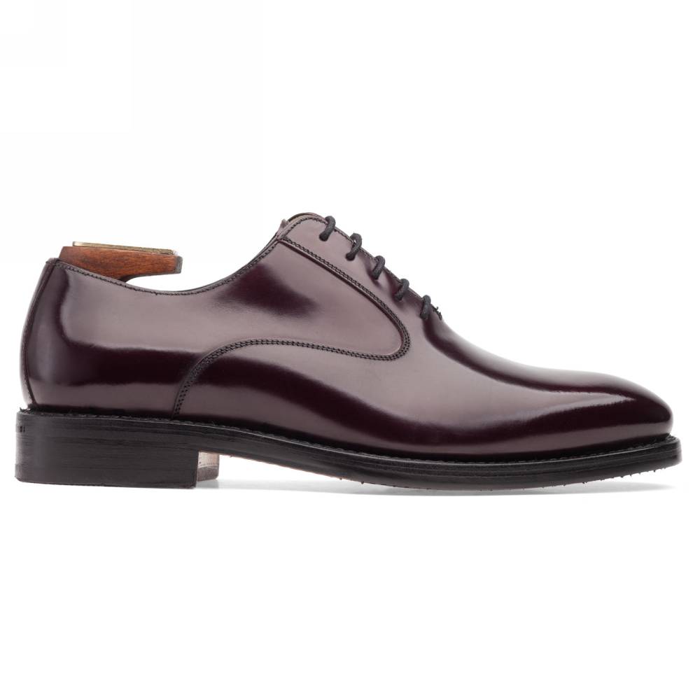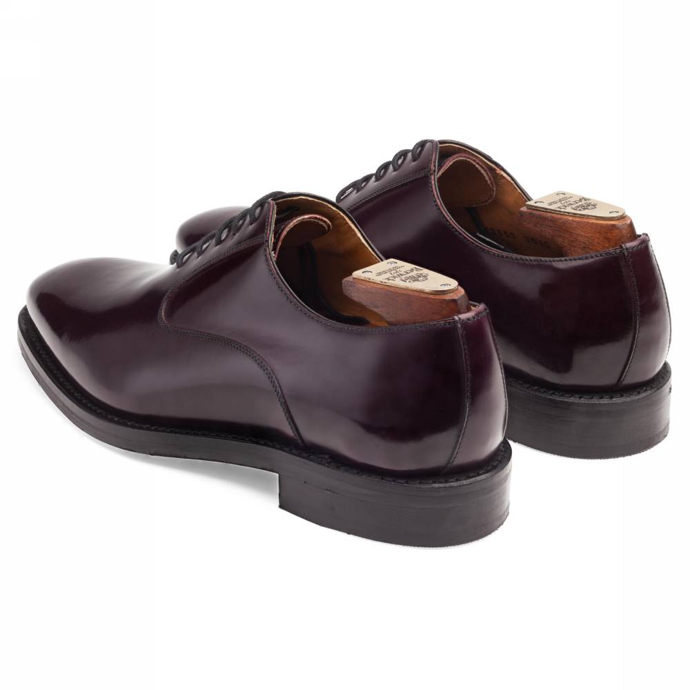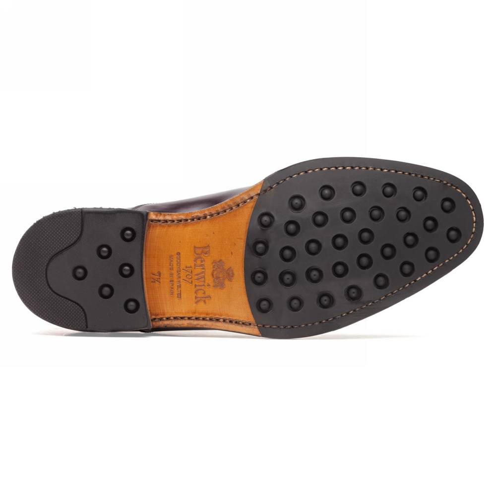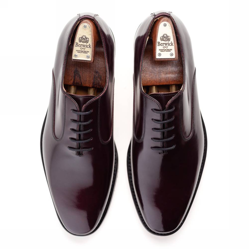 Классические туфли оксфорды испанского бренда Berwick насыщенного бордового цвета на комбинированной подошве из кожи и резины. Верх выполнен из плотной полированной телячьей кожи Rois с изысканным блеском, благодаря которому она выглядит подобно конской коже (cordovan leather). Внутренняя отделка из тонкой кожи горчичного оттенка. Конструкция Goodyear Welted.