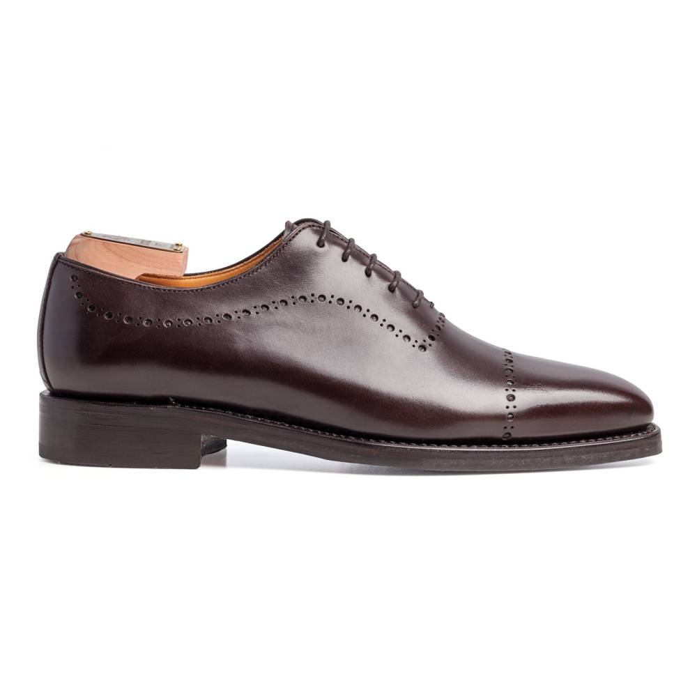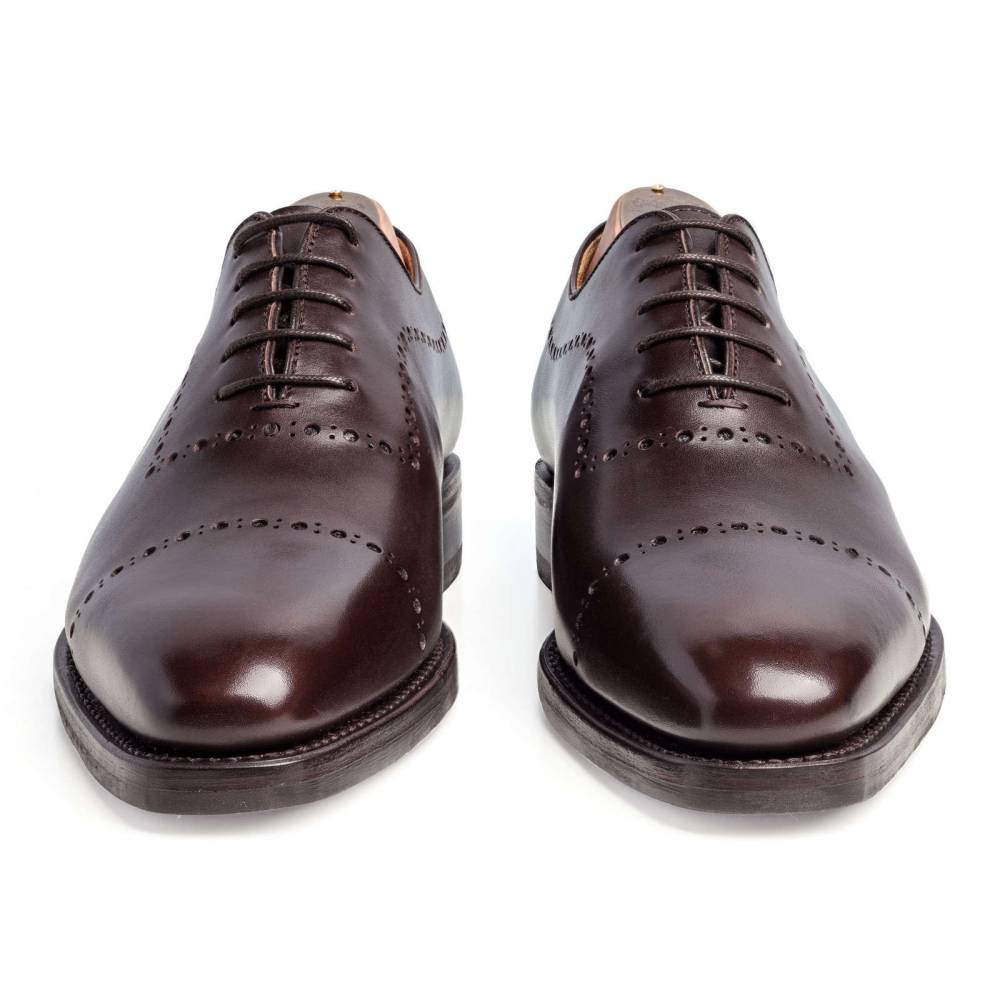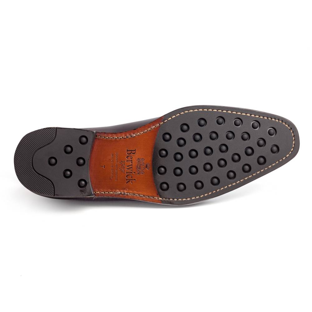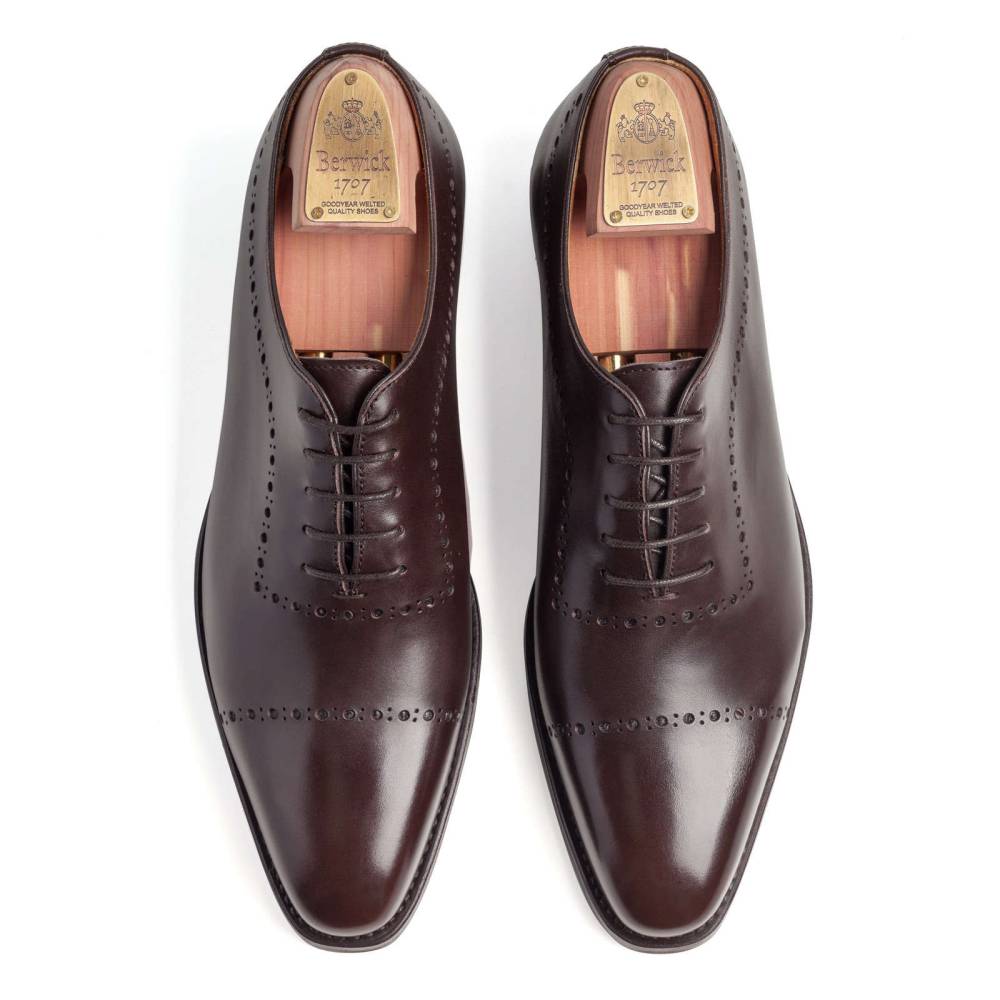 Элегантные туфли оксфорды Berwick на комбинированной подошве из кожи и резины. Верх выполнен из цельной телячьей кожи тёмно-коричневого цвета. Единственный шов расположен в области пятки. Внутренняя отделка из тонкой кожи бежевого цвета. Модель украшена перфорированным узором. Конструкция Goodyear Welted.