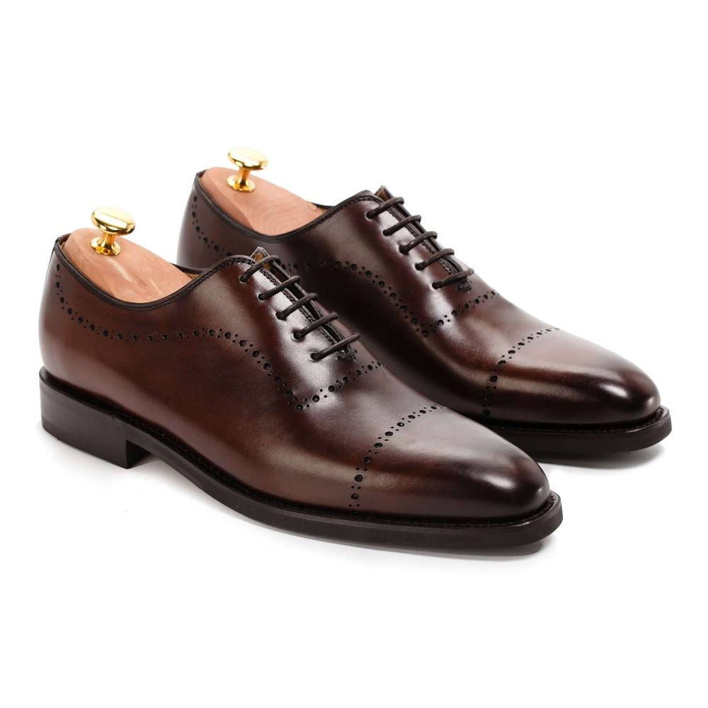 Туфли оксфорды Berwick с фирменной профилактикой из прочной ребристой резины на подошве. Верх выполнен из цельной телячьей кожи тёмно-коричневого цвета с градиентным затемнением на мысе. Единственный шов расположен в области пятки. Внутренняя отделка из тонкой кожи бежевого цвета. Модель украшена перфорированным узором. Конструкция Goodyear.