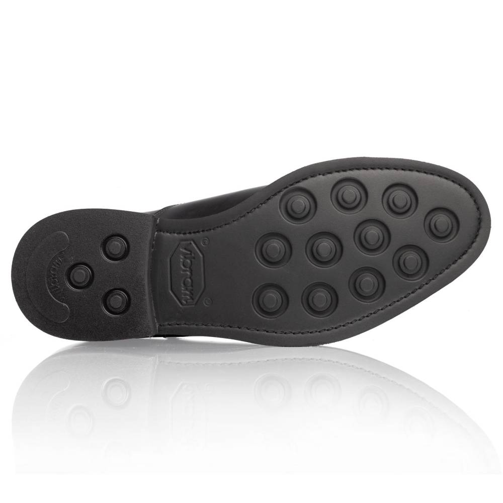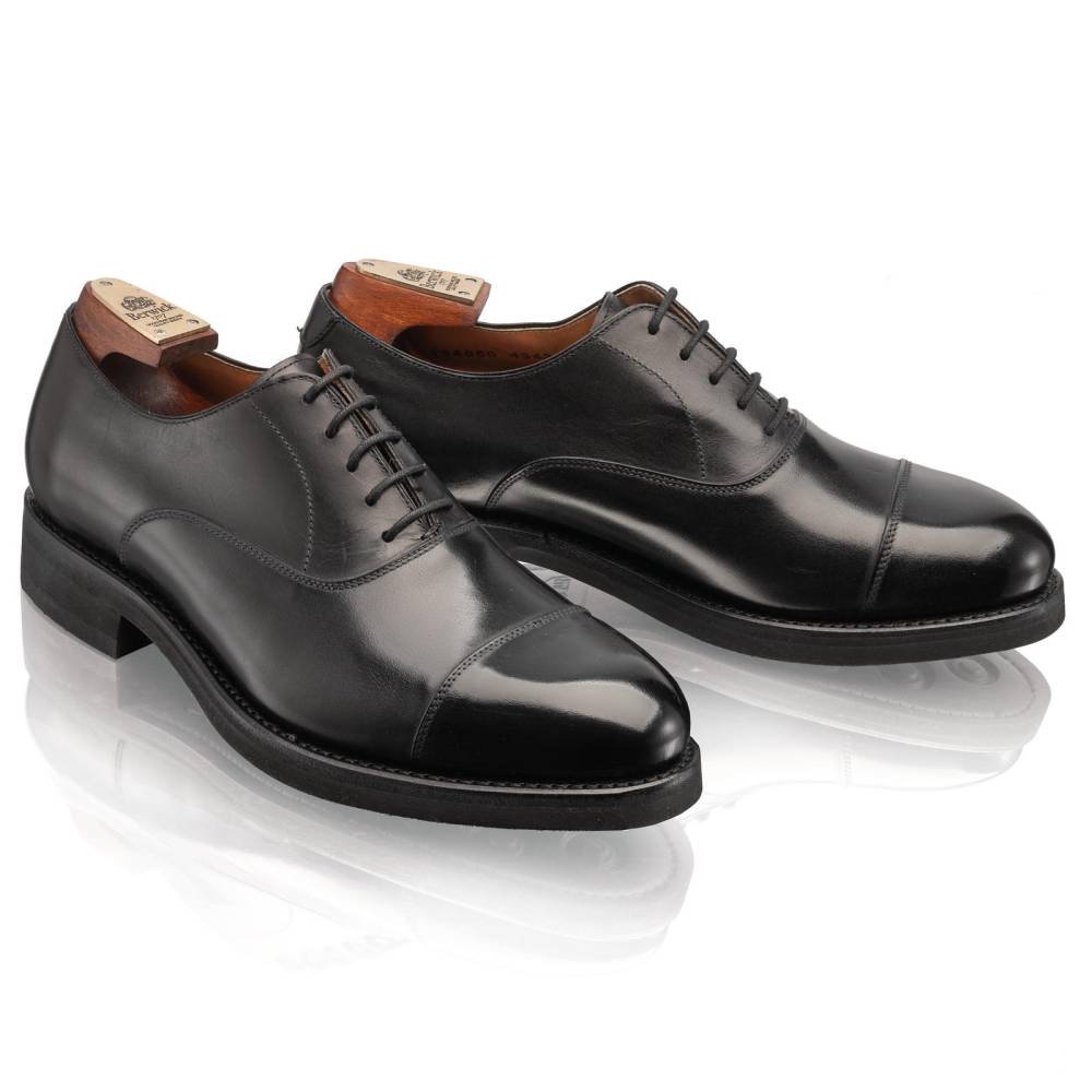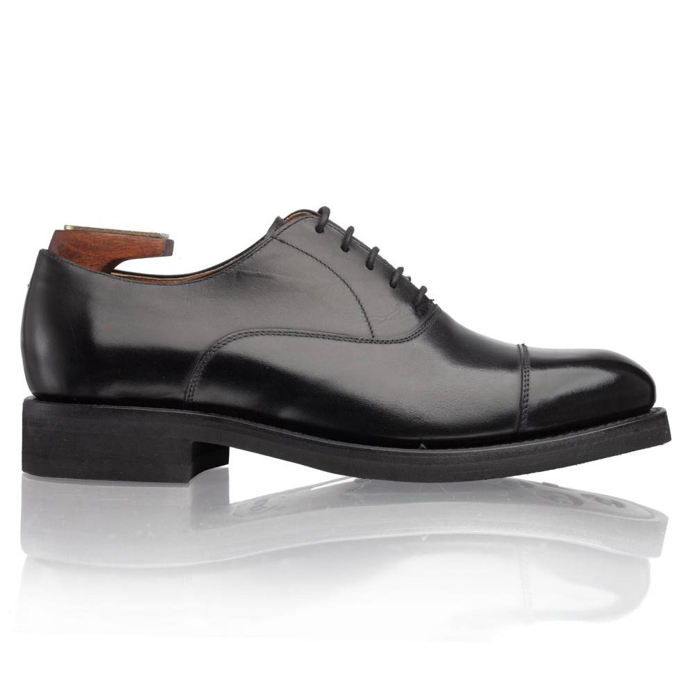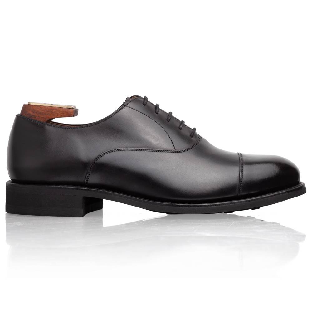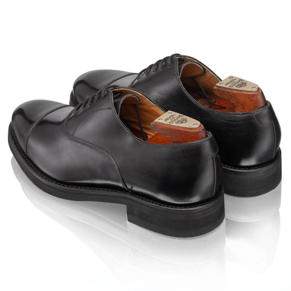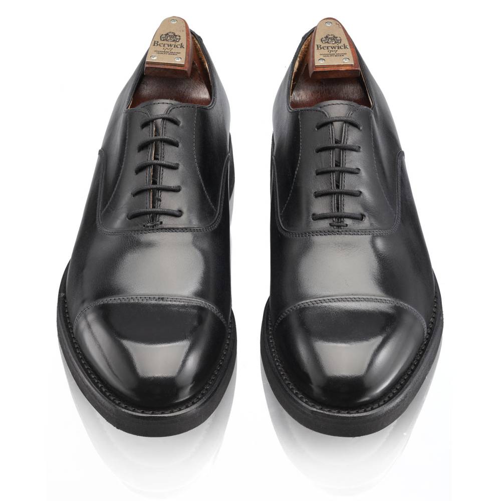 Массивные оксфорды с отрезным мысом (cap toe oxford) испанской фабрики Berwick. Верх выполнен из плотной телячьей кожи чёрного цвета. На нижнюю часть подошвы установлена сплошная резина Vibram с неглубоким протектором. Это позволяет носить обувь даже в дождливую погоду, не жертвуя градусом строгости осеннего или зимнего гардероба. Конструкция Goodyear Welted.