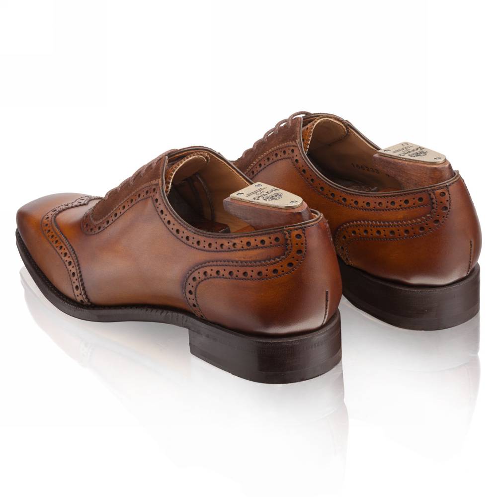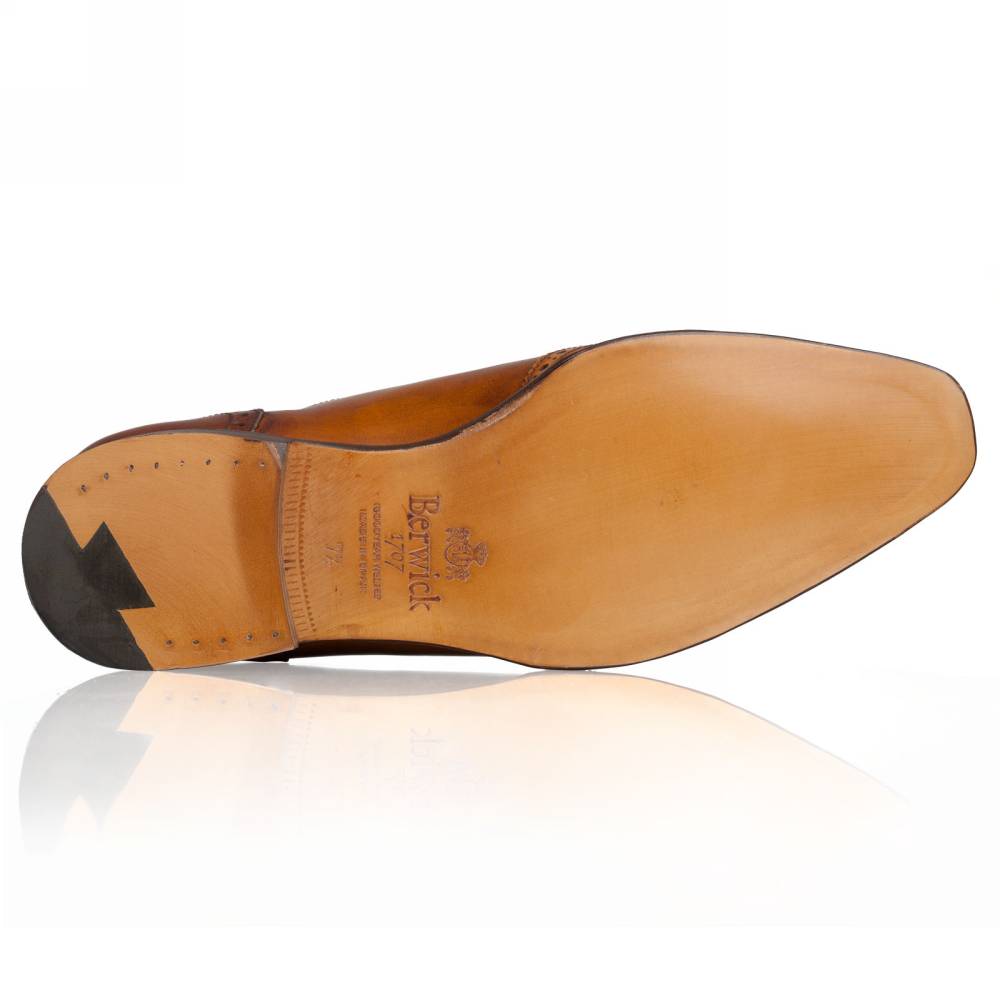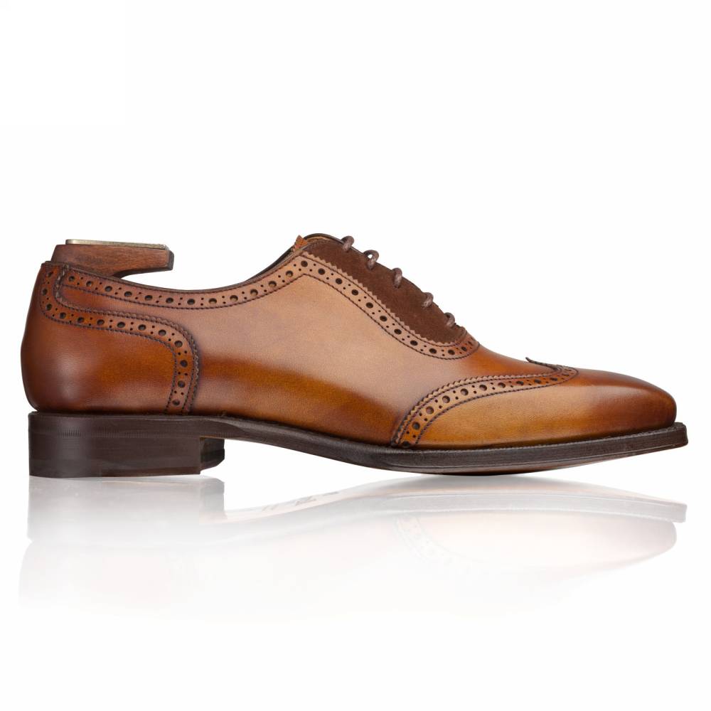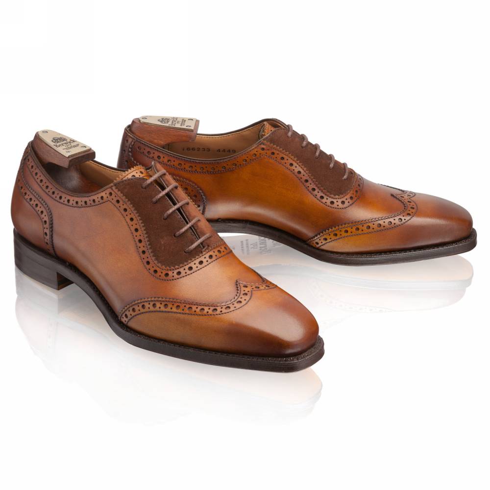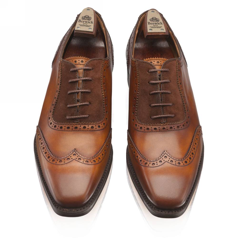 Светло-коричневые оксфорды Berwick на гладкой кожаной подошве с закрытым швом. Верх выполнен из телячьей кожи в сочетании с коричневой замшей. Особенностью модели является ручная окраска, которая создает неповторимый внешний вид кожи с неравномерной игрой цвета и градиентным затемнением на мысе. Внутренняя отделка из тонкой кожи горчичного оттенка. Конструкция Goodyear Welted.