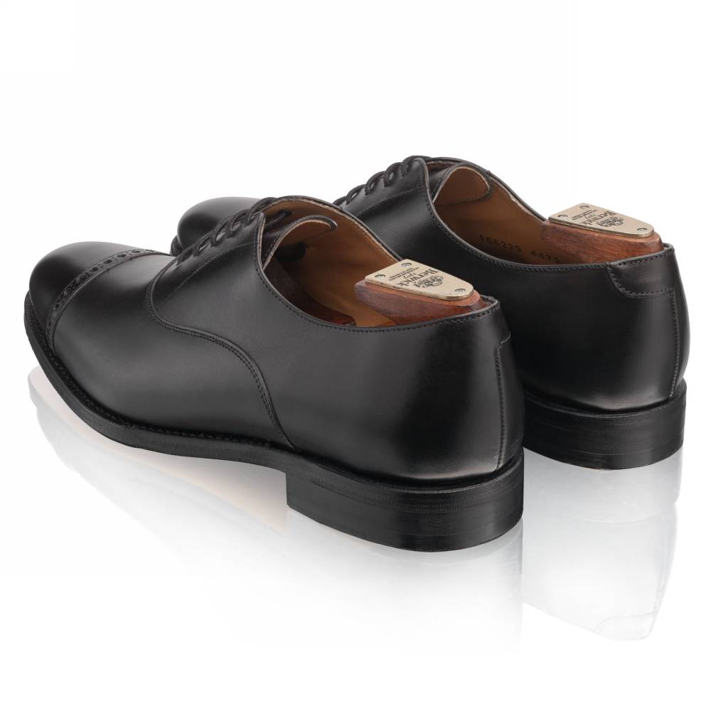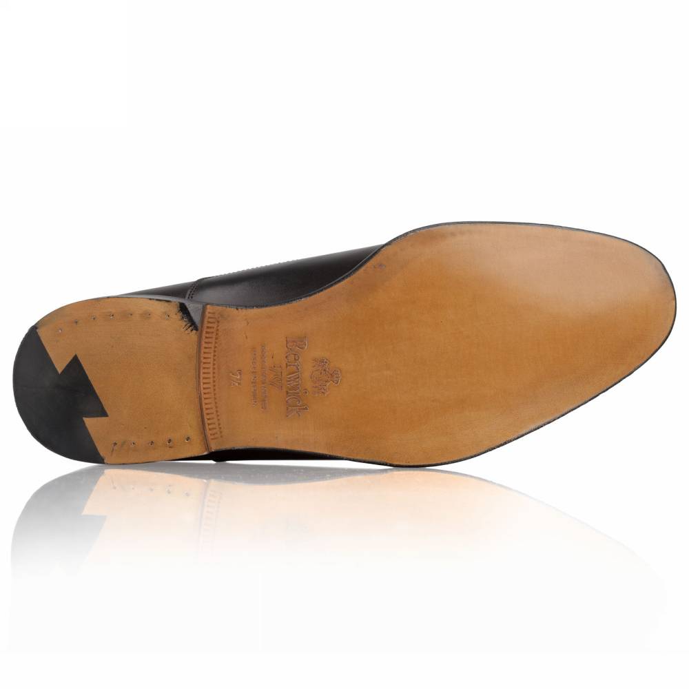 Деловые мужские туфли-оксфорды испанского бренда Berwick. Верх модели выполнен из плотной телячьей кожи чёрного цвета. Мыс декорирован лаконичной перфорацией на мыске. Внутренняя отделка из тонкой кожи горчичного оттенка. На данную пару установлена кожаная подошва с закрытым швом. Конструкция Goodyear Welted.