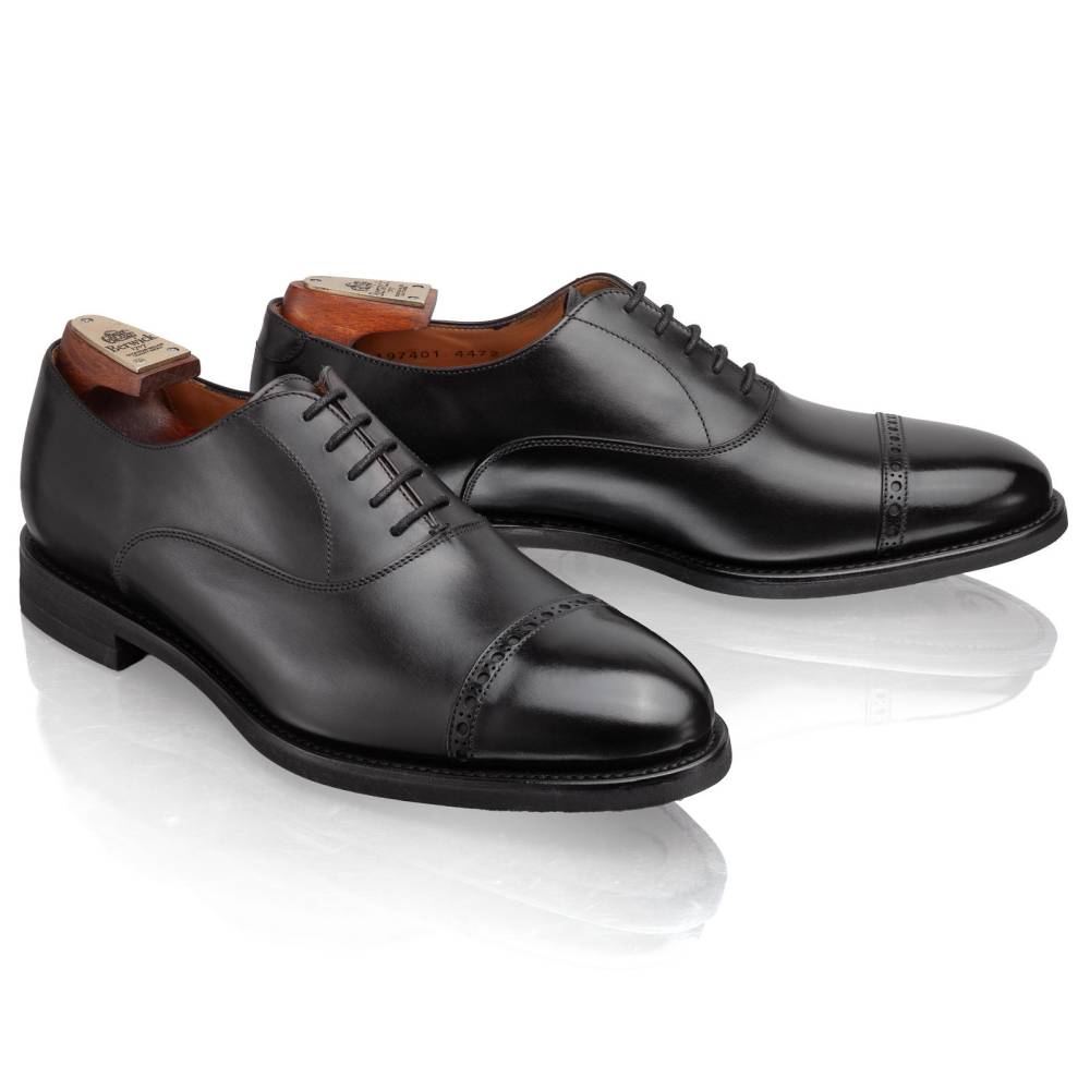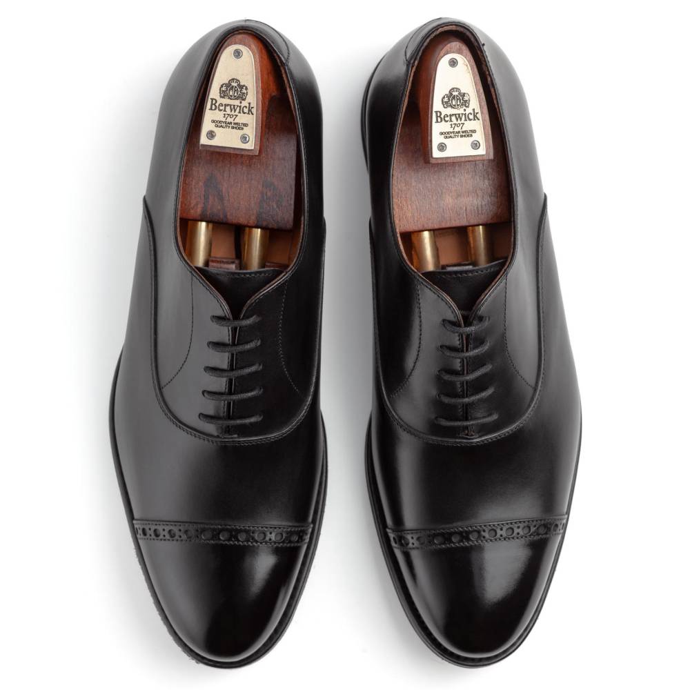Деловые мужские оксфорды испанского бренда Berwick из плотной телячьей кожи чёрного цвета. Отрезной мыс декорирован лаконичной перфорацией. Внутренняя отделка из тонкой кожи горчичного оттенка. На данную пару установлена практичная резиновая подошва Vibram. Конструкция Goodyear Welted.