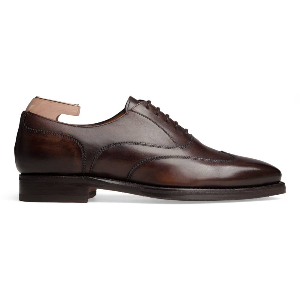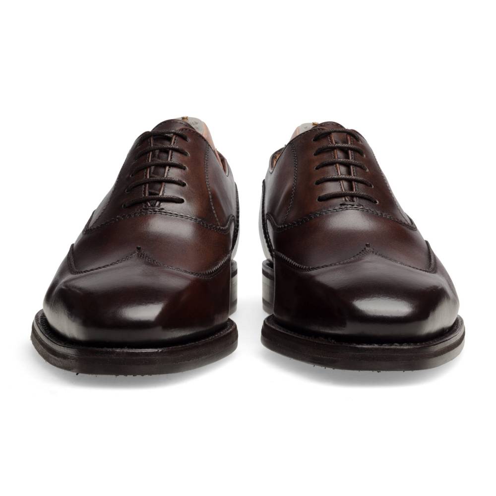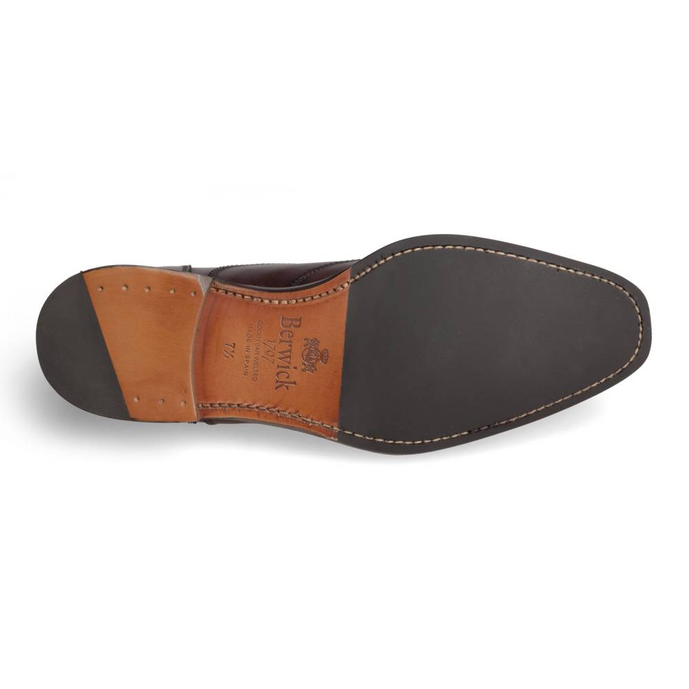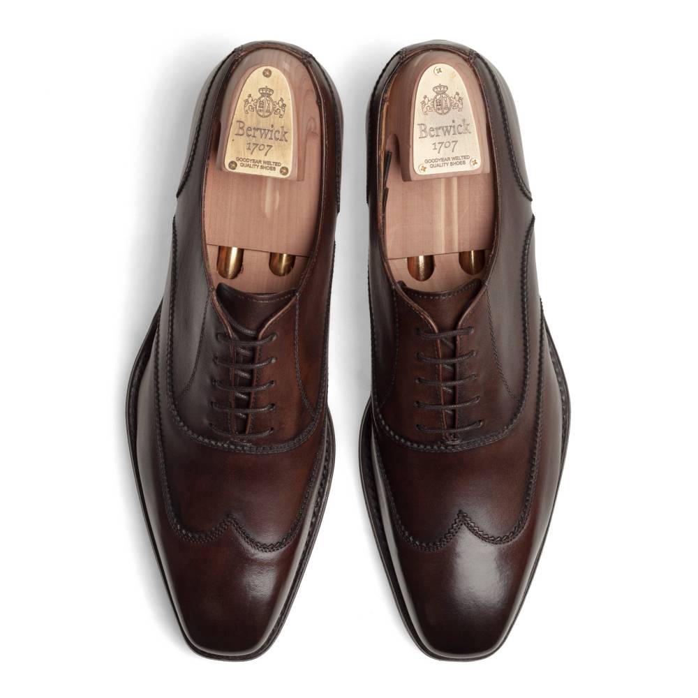 Тёмно-коричневые оксфорды Berwick на комбинированной подошве. Лаконичная модель без перфорации, украшенная двойной строчкой, имитирующей рисунок брог. Верх изготовлен из телячьей кожи, окрашенной вручную: каждая пара отличается неповторимой игрой цвета и плавным затемнением на мысe и пятке. Подкладка сделана из тонкой кожи горчичного оттенка.
