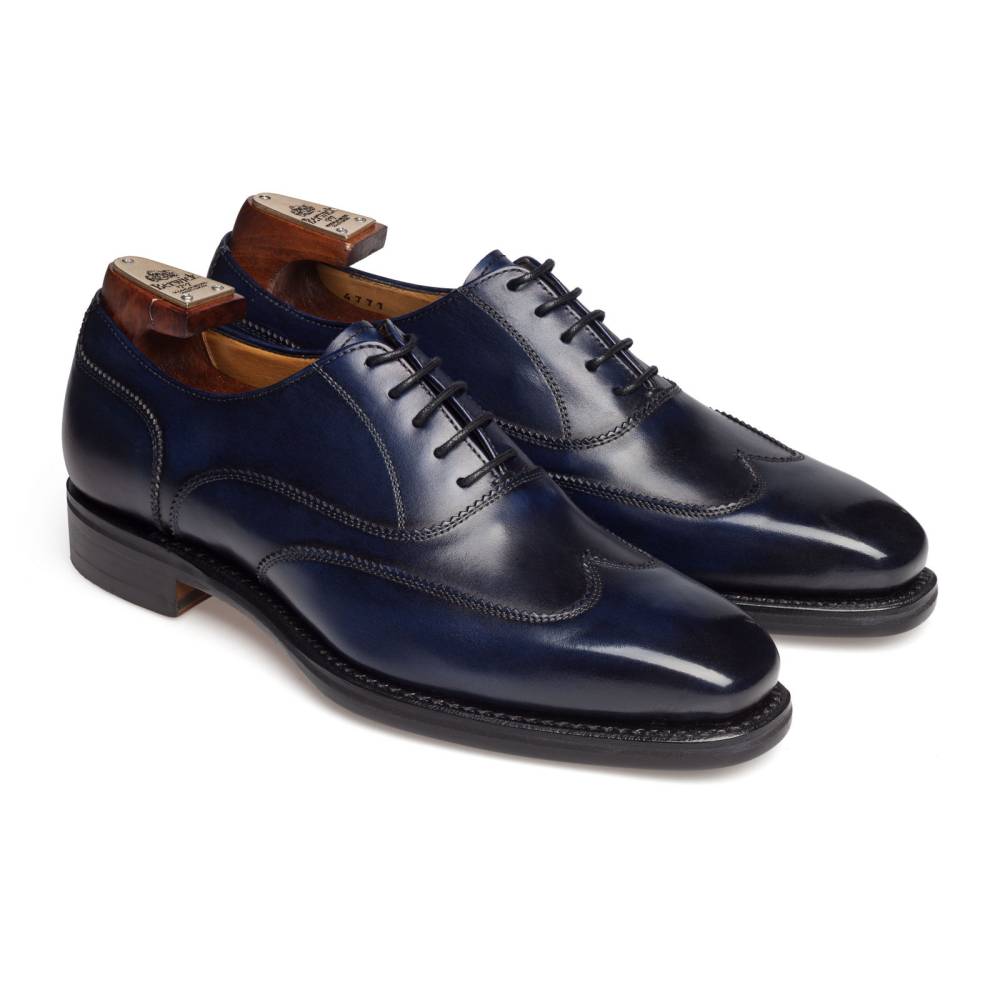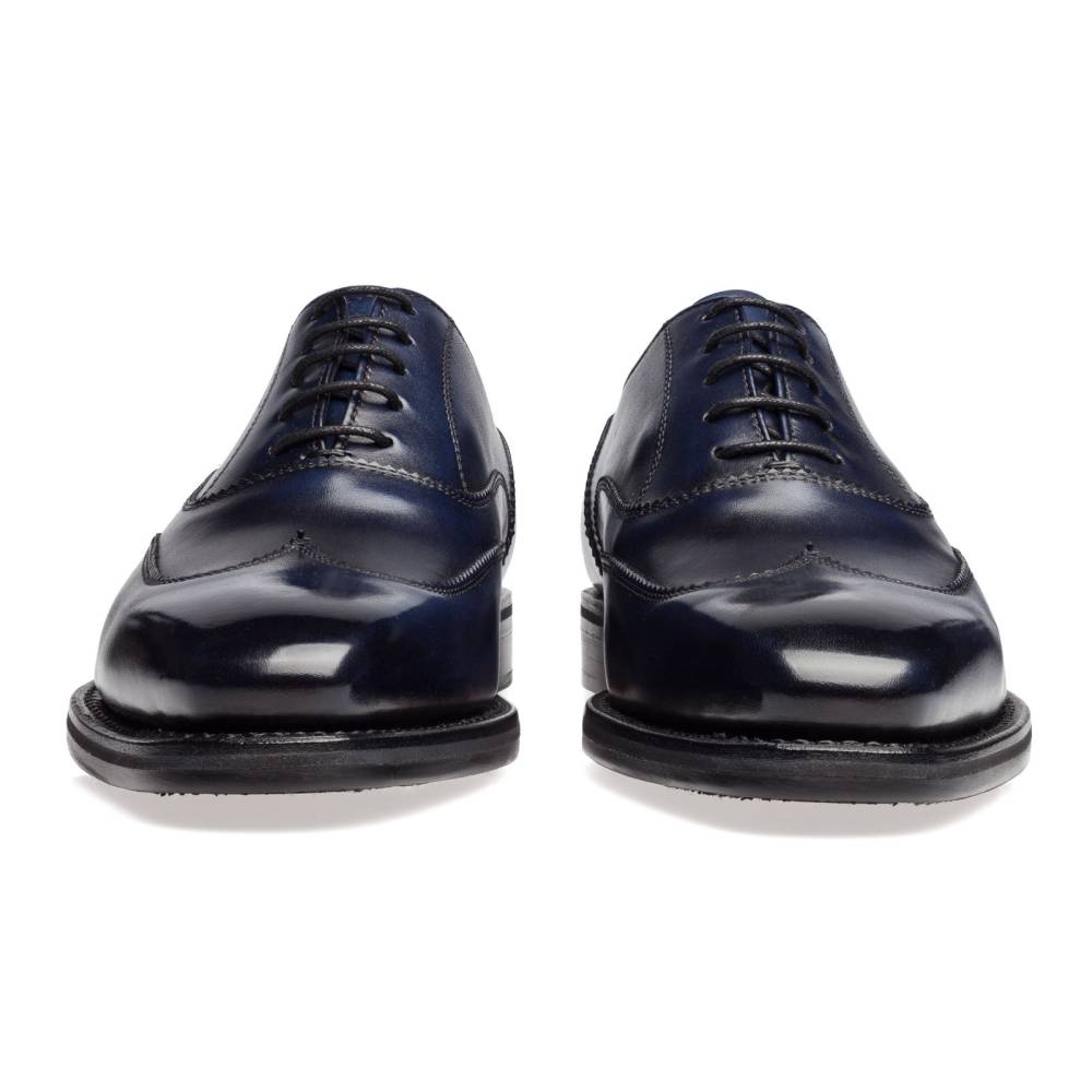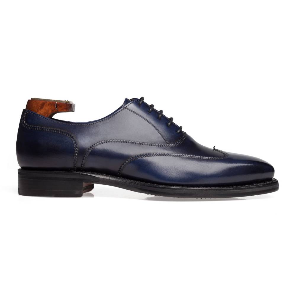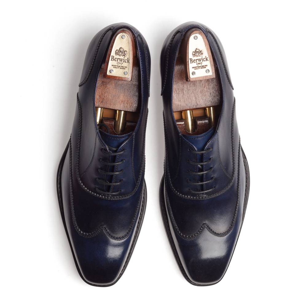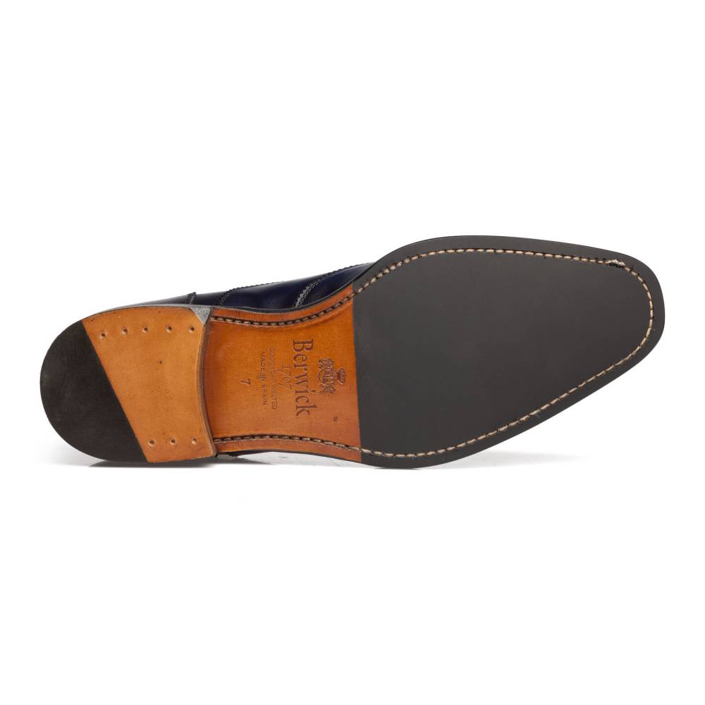 Тёмно-синие оксфорды Berwick на комбинированной подошве. Лаконичная модель без перфорации, украшенная двойной строчкой, имитирующей рисунок брог. Верх изготовлен из телячьей кожи, окрашенной вручную: каждая пара отличается неповторимой игрой цвета и плавным затемнением на мысe и пятке. Подкладка сделана из тонкой кожи горчичного оттенка.