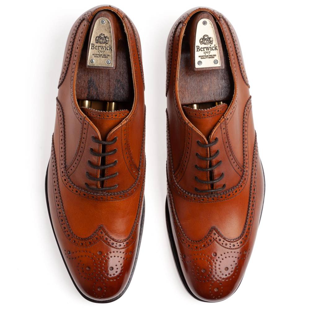 Оксфорды броги из коллекции испанского бренда Berwick. Модель выполнена из плотной телячьей кожи светло-коричневого цвета растительного дубления. Лёгкие затемнения на коже и градиент указывают на то, что материал обрабатывался по технологии "burnished". Такой эффект получается благодаря нанесению воска более тёмного оттенка и его нагреву. На обувь установлена кожаная подошва от знаменитой немецкой фабрики Joh. Rendenbach. Внутренняя отделка из тонкой кожи горчичного оттенка. Конструкция Goodyear Welted.