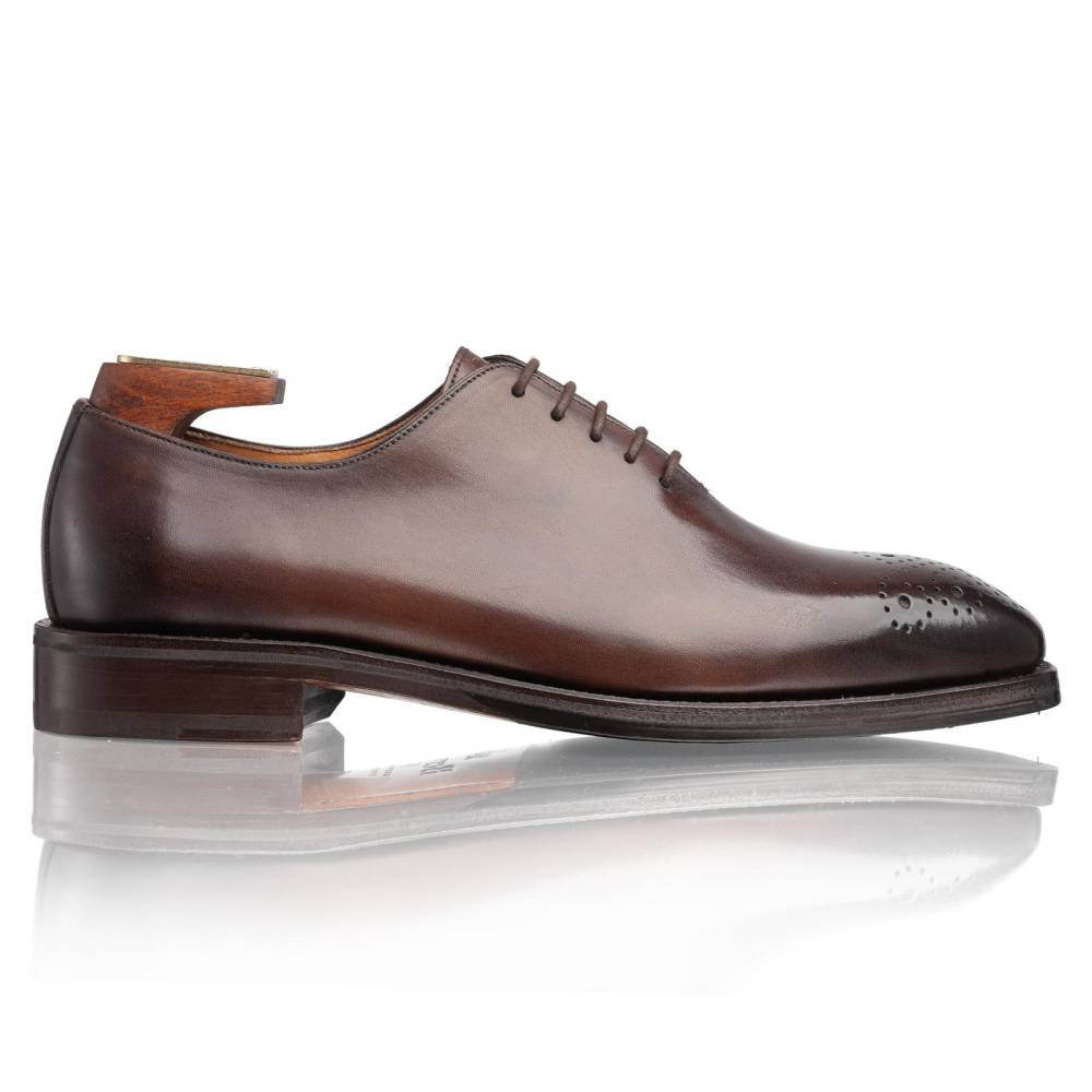 Тёмно-коричневые оксфорды Berwick на кожаной подошве. Верх выполнен из единого отрезка телячьей кожи. Такая техника производства делает внешний вид обуви более целостным и элегантным. Единственный шов расположен в области пятки. Особенностью модели является ручная окраска, которая создаёт неповторимый внешний вид кожи с неравномерной игрой цвета и градиентным затемнением. Мыс обуви украшен традиционным медальоном. Внутренняя отделка из тонкой кожи горчичного оттенка. Конструкция Goodyear Welted.