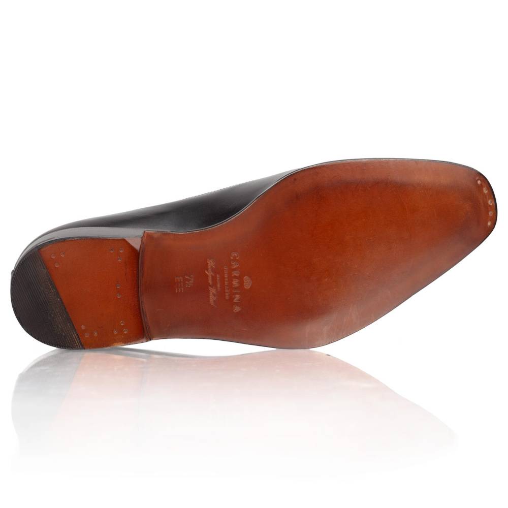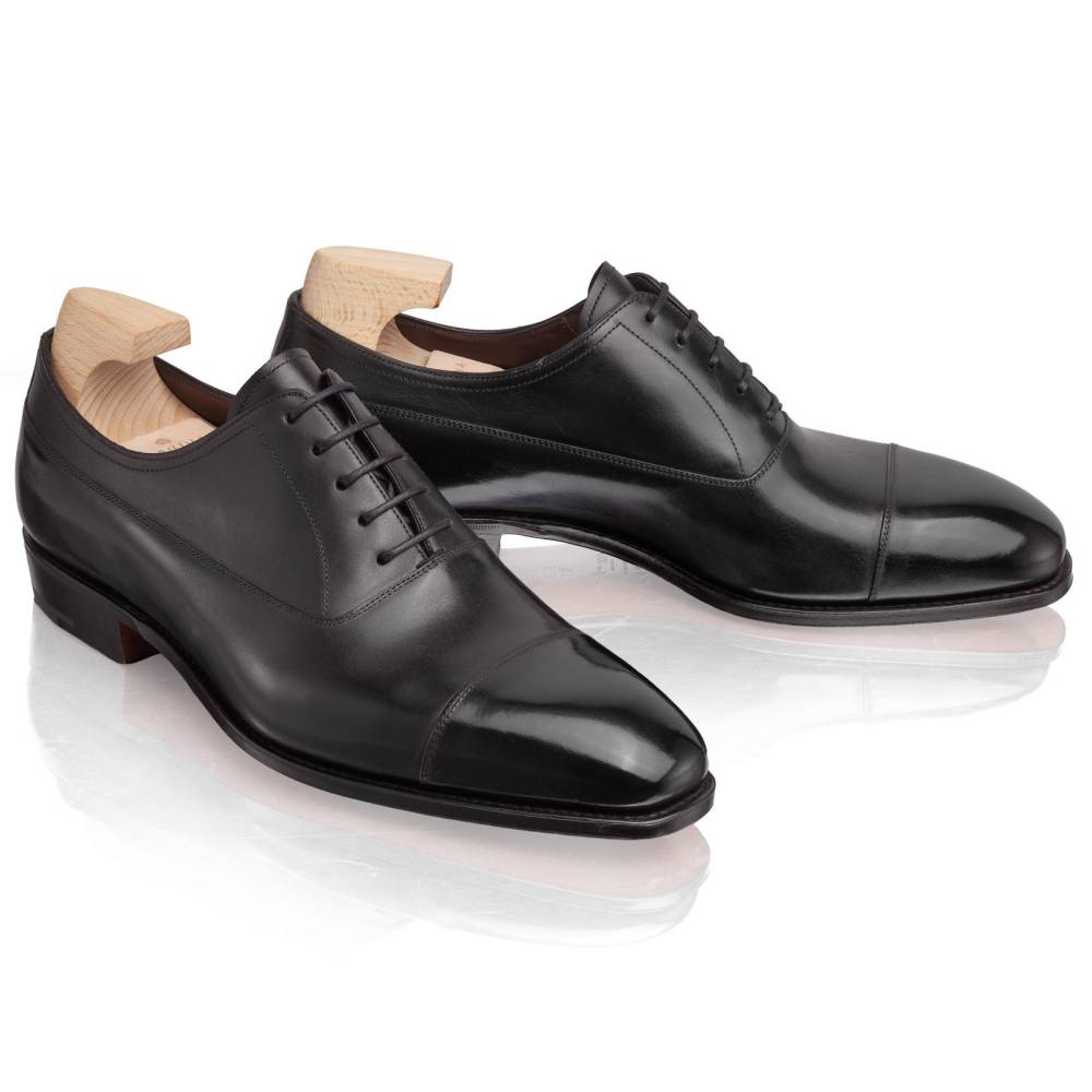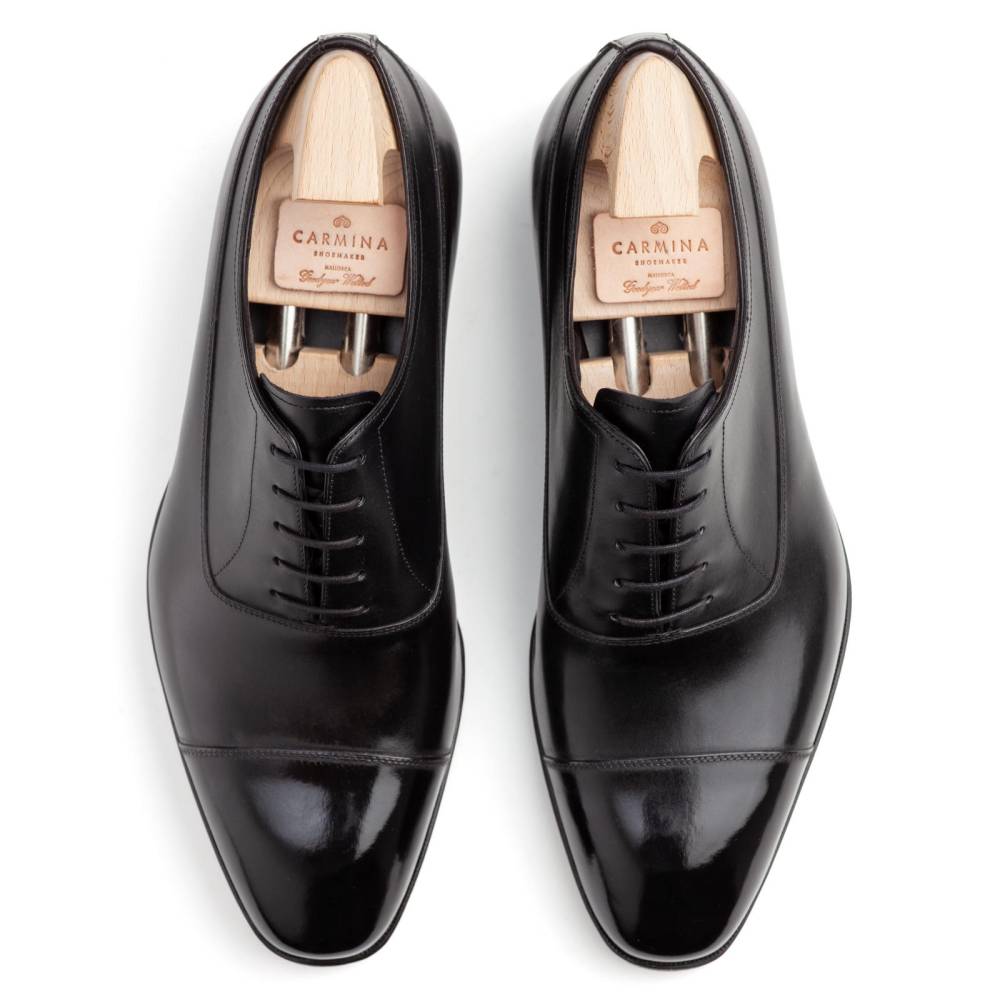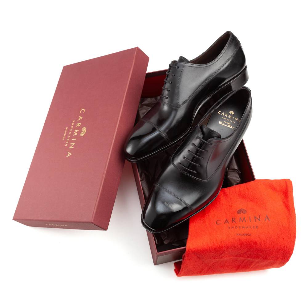 Формальные классические оксфорды с отрезным мыском (Cap Toe) испанского бренда Carmina. Верх выполнен из телячьей кожи (Box Calf) чёрного цвета, хромового дубления. Внутренняя подкладка из кожи растительного дубления обеспечивает комфорт и воздухопроницаемость. Модель изготовлена по специальному заказу (MTO) эксклюзивно для нашего магазина и оснащена скошенным кубинским каблуком (Cuban heel). Кожаная подошва с закрытым каналом. Изготовлена в конструкции Goodyear Welted.