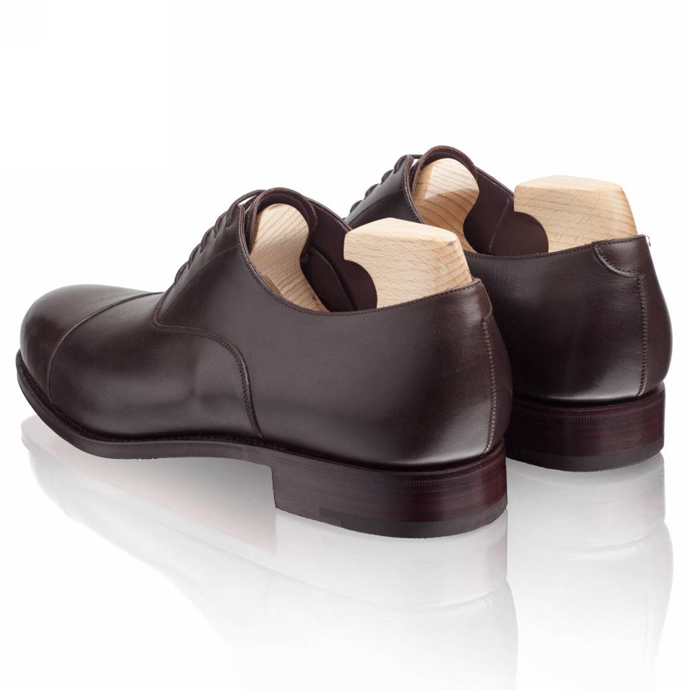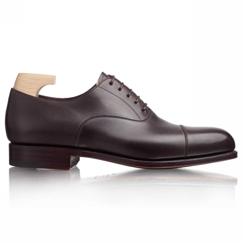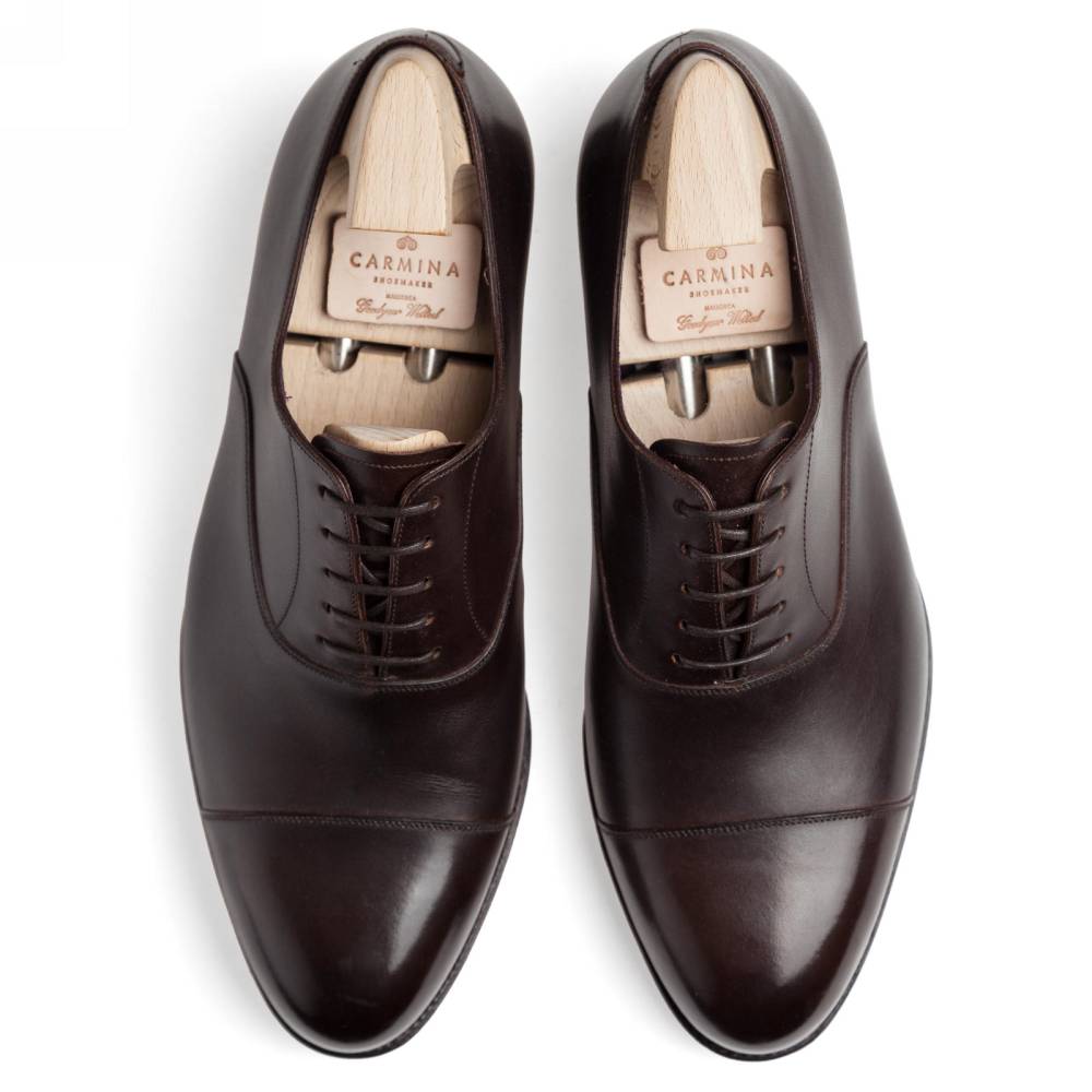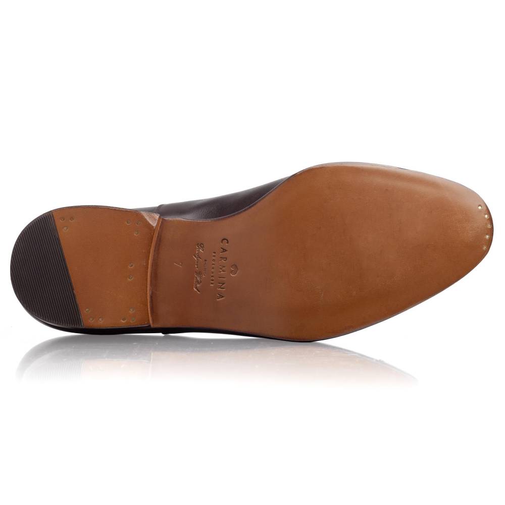 Строгие оксфорды с отрезным мысом испанского бренда Carmina на кожаной подошве. Верх выполнен из плотной высококачественной телячьей кожи тёмно-коричневого цвета. Особенностью модели является подкладка из тонкой гладкой кожи оригинального фиолетового цвета. Шов на подошве закрыт. Это делает её гладкой, а также защищает от проникновения влаги. Конструкция Goodyear Welted.