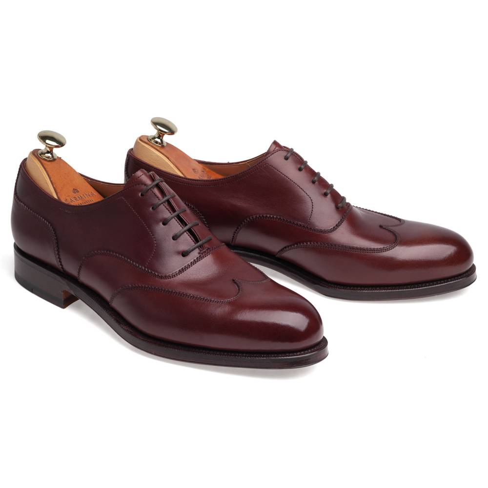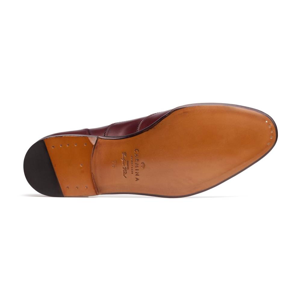 Классические мужские оксфорды испанской марки Carmina. Верх выполнен из бордовой телячьей кожи высокого качества. Особенностью модели является лаконичный дизайн, лишенный перфорации, но в то же время напоминающий узор брог. Внутренняя отделка из тонкой кожи горчичного оттенка. Кожаная подошва. Конструкция Goodyear Welted.
