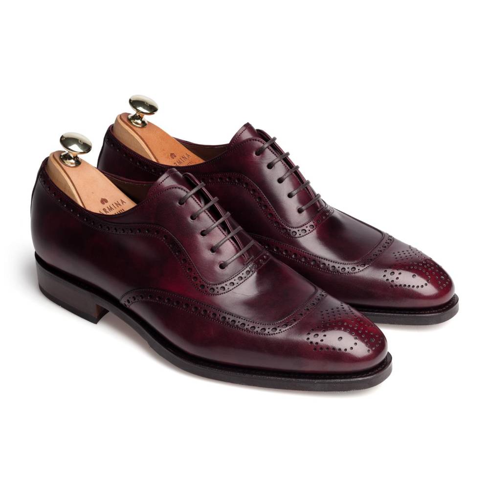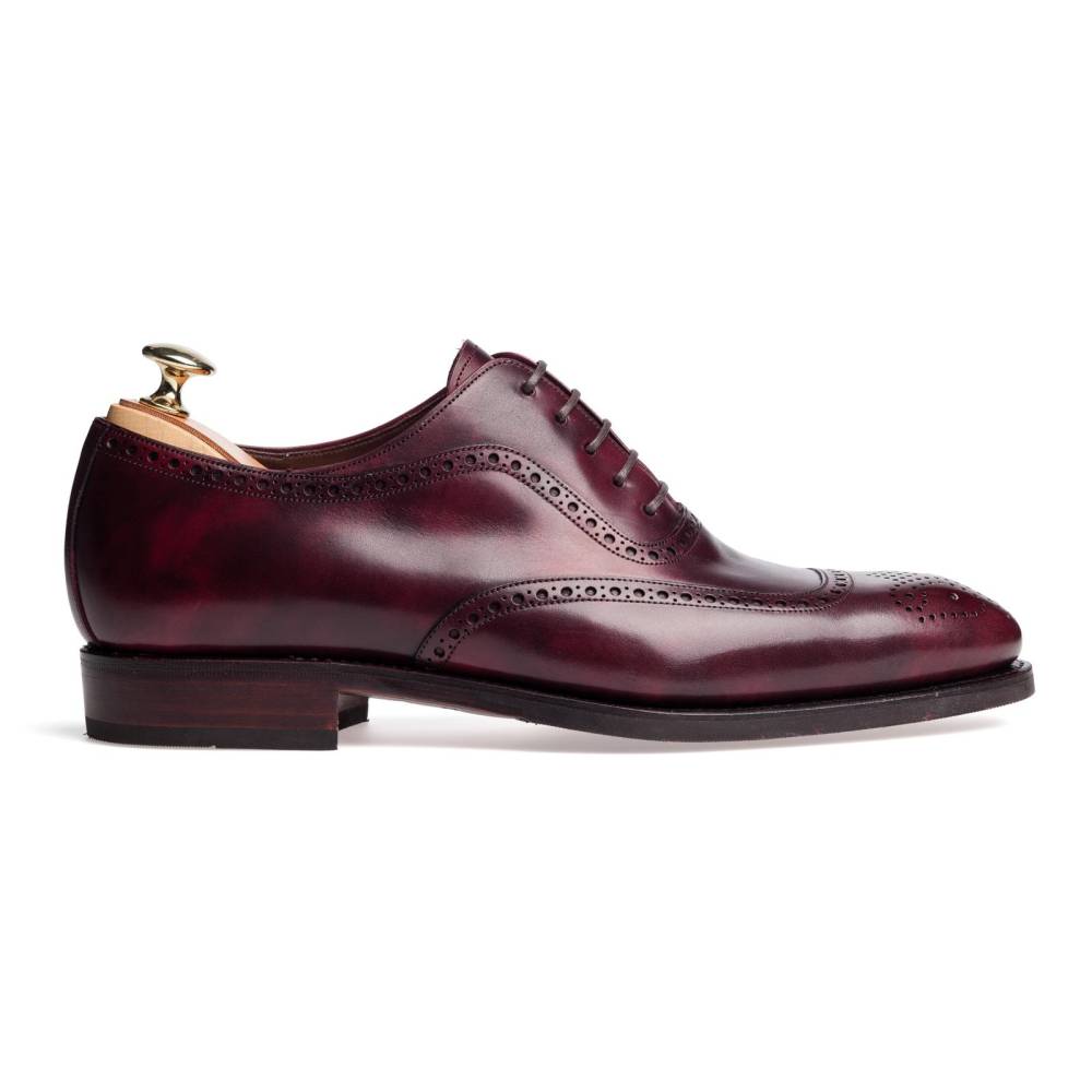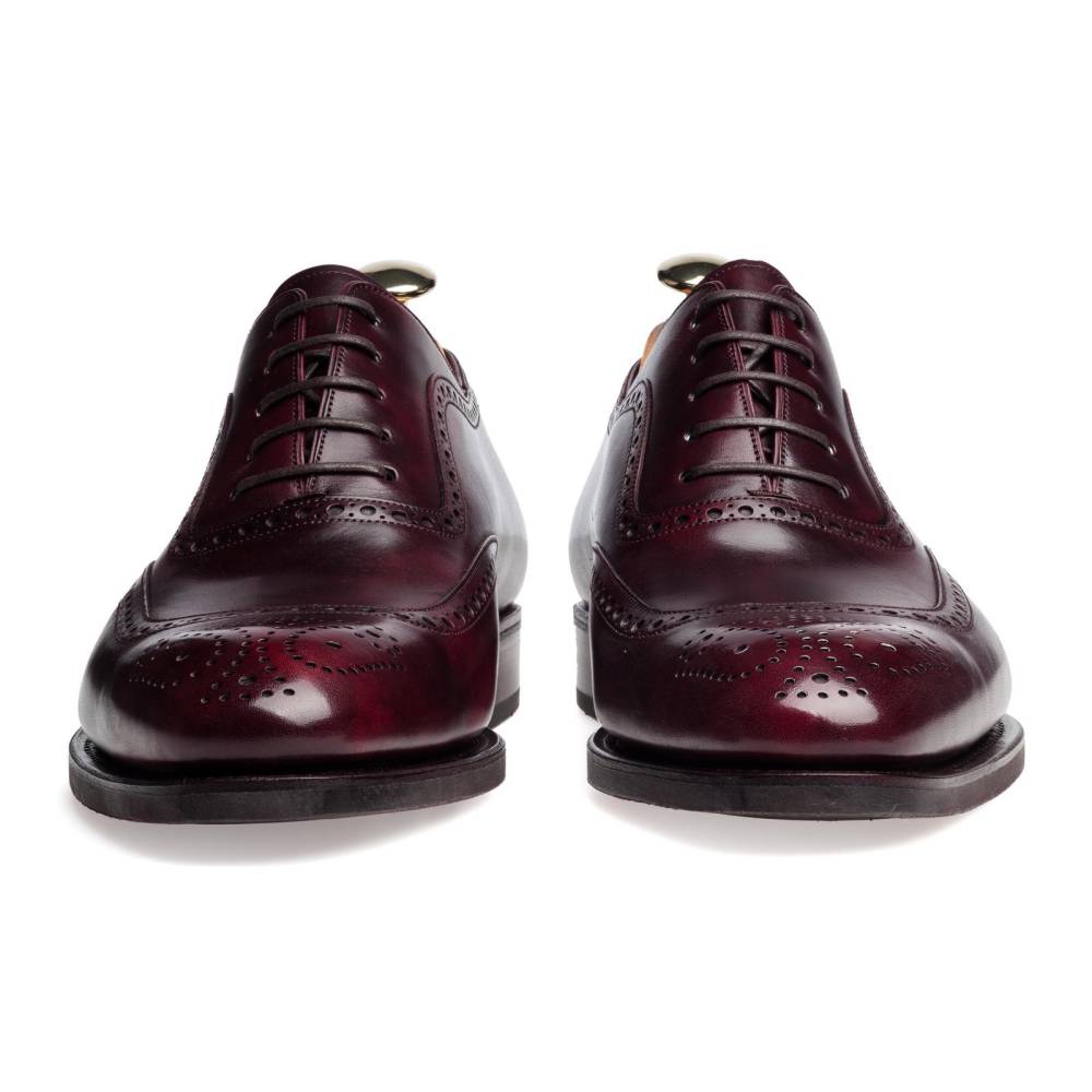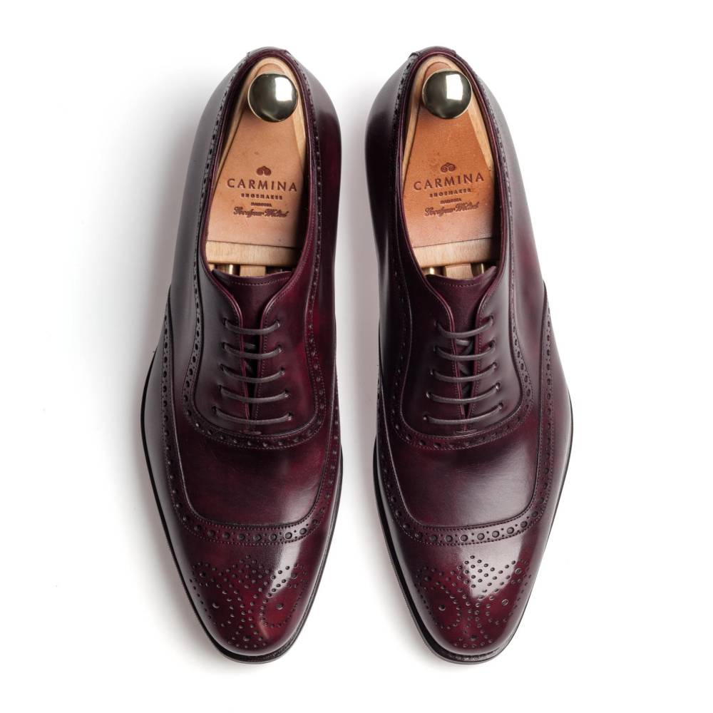 Повседневные туфли Carmina Shoemaker тёмно-бордового цвета на комбинированной подошве из кожи и резины. Верх обуви выполнен из гладкой телячьей кожи «museum calf». Особенностью данного типа кожи является характерный «пятнистый окрас», который схож с узорами на мраморе. Модель отличается оригинальными дизайном традиционной перфорации «brogue». Конструкция Goodyear Welted.