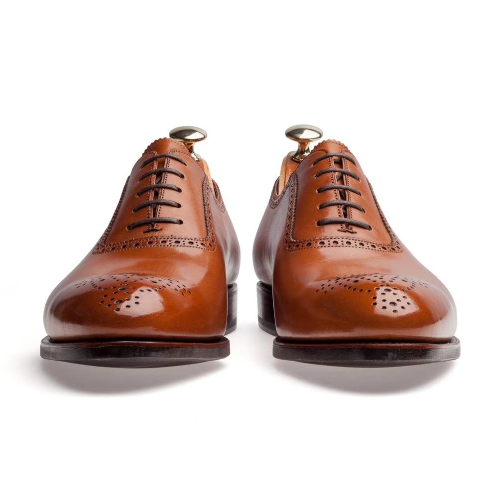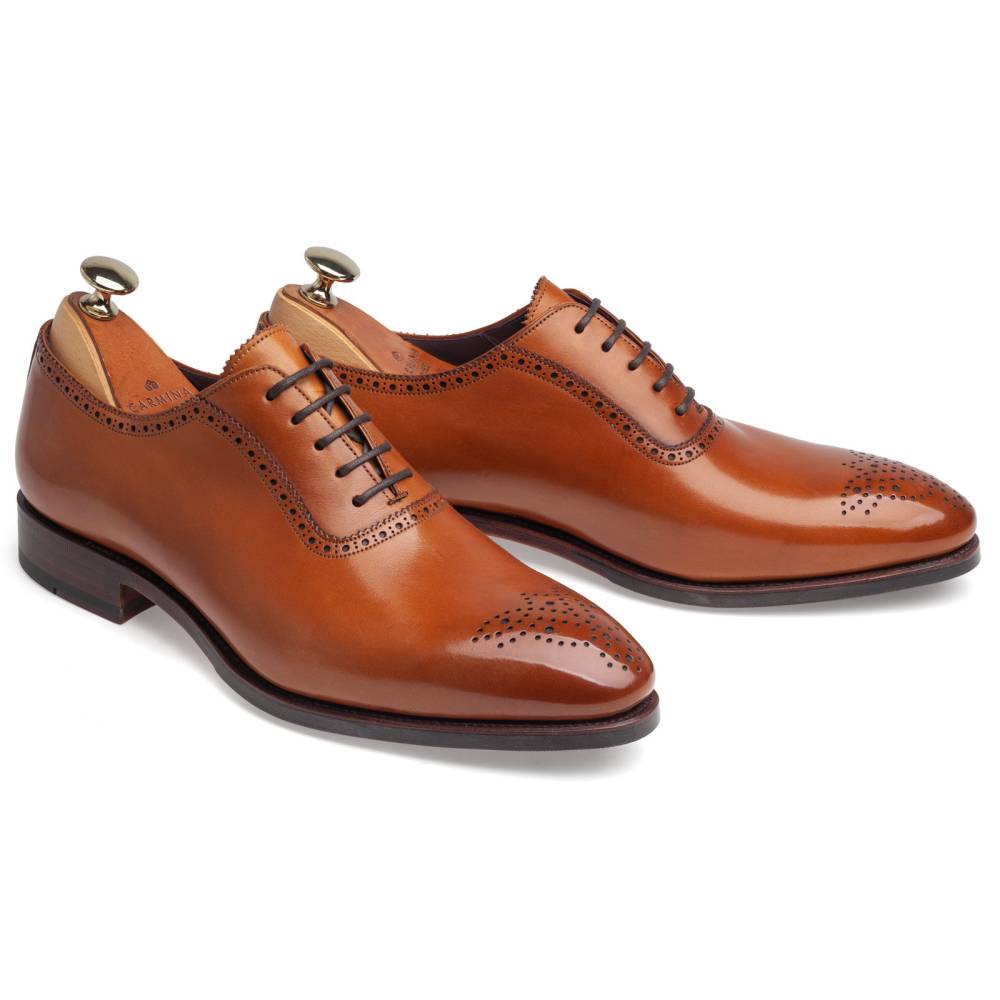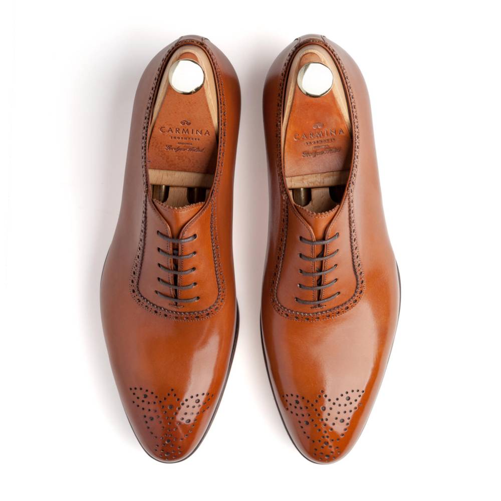 Светло-коричневые оксфорды-аделаиды от испанского бренда Carmina. Верх выполнен из высококачественной телячьей кожи, декорирован традиционной перфорацией и узорчатым медальоном на мысе. Модель имеет прочную и гибкую комбинированную подошву. Конструкция Goodyear Welted.