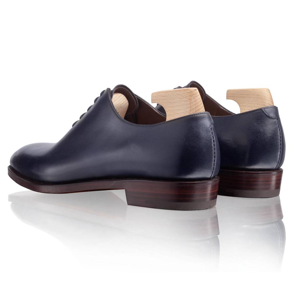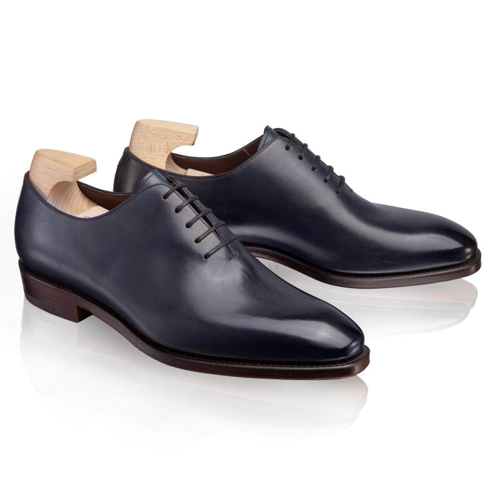 Мужские туфли-оксфорды Carmina на кожаной подошве c закрытым швом. Модель выполнена по технологии «whole cut» (из одного отрезка кожи). Такая техника производства делает внешний вид обуви более целостным и элегантным. Единственный шов расположен в области пятки. Верх выполнен из тёмно-синей телячьей кожи. Конструкция Goodyear Welted.