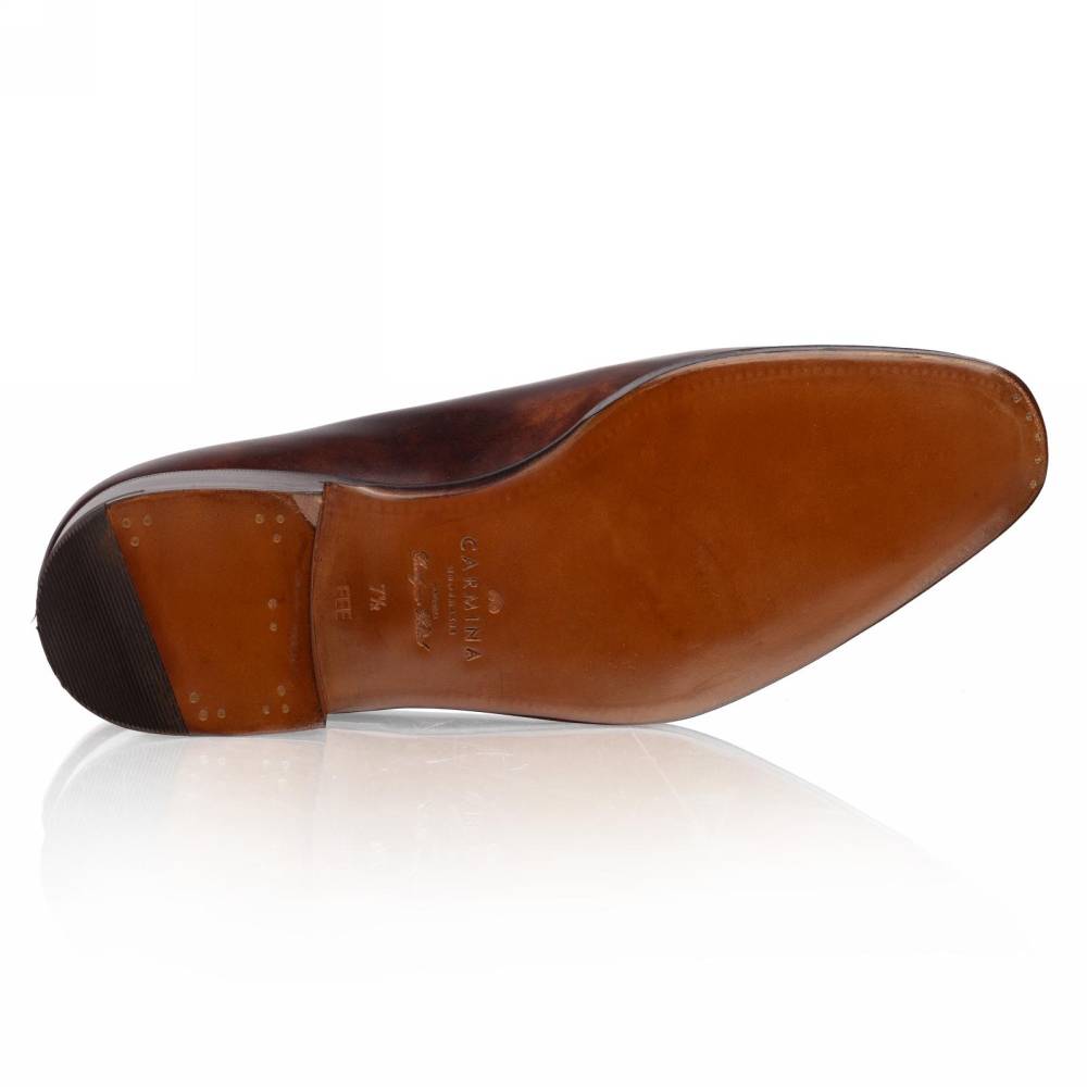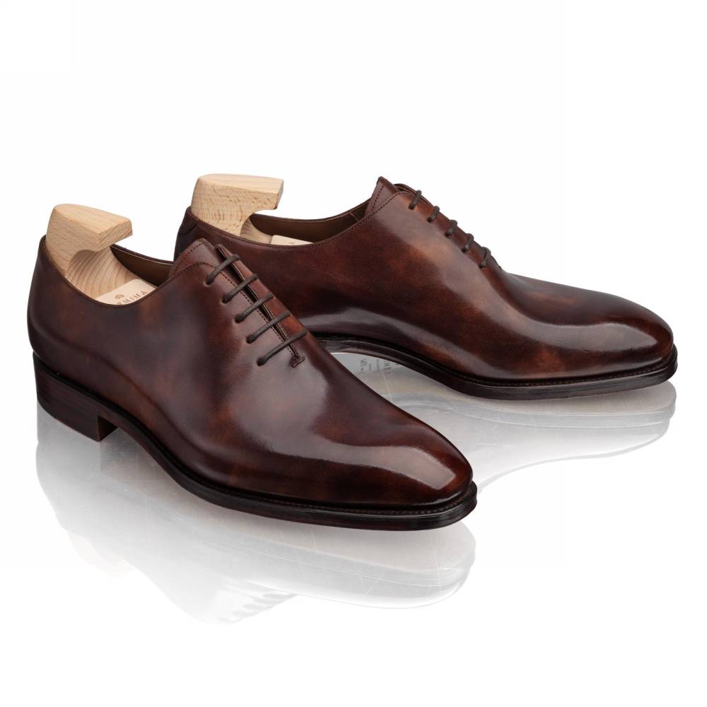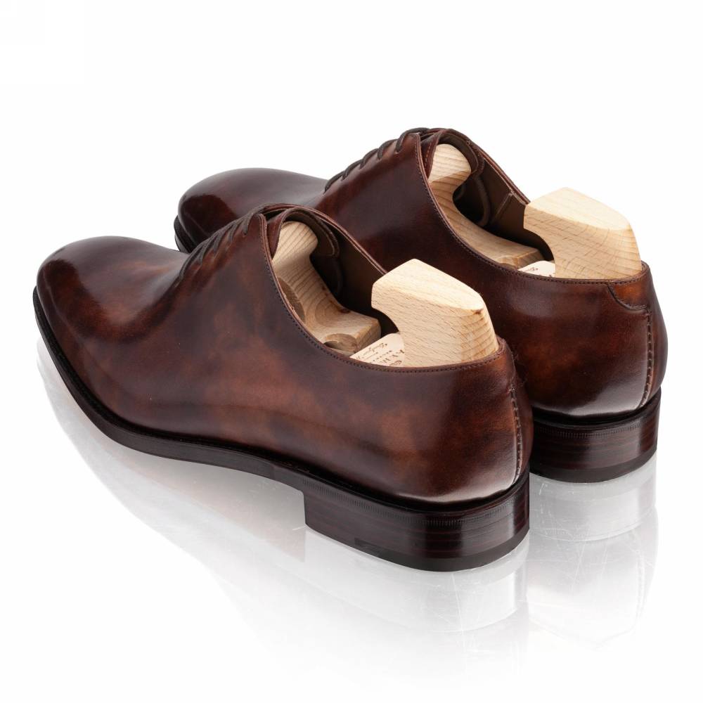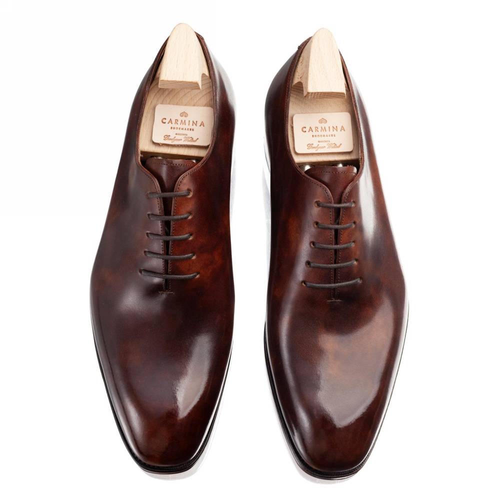 Эффектные тёмно-коричневые цельнокроеные оксфорды испанского бренда Carmina. Верх выполнен из цельного отрезка высококачественной телячьей кожи «museum calf» с единственным швом в области пятки. Особенностью данного типа кожи является характерный «пятнистый окрас», который схож с узорами на мраморе. Подкладка изготовлена из тонкой кожи растительного дубления. Модель имеет гладкую кожаную подошву с закрытым швом. Конструкция Goodyear Welted.
