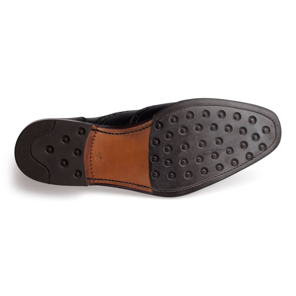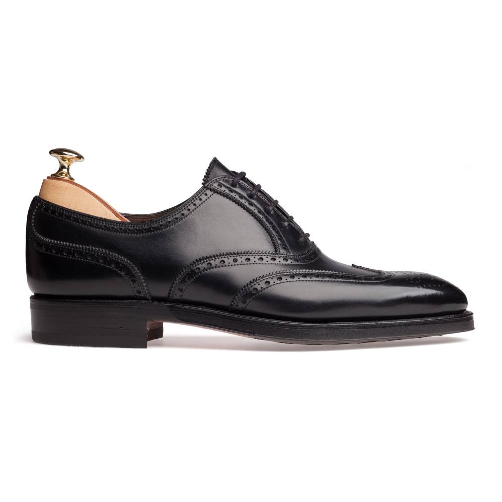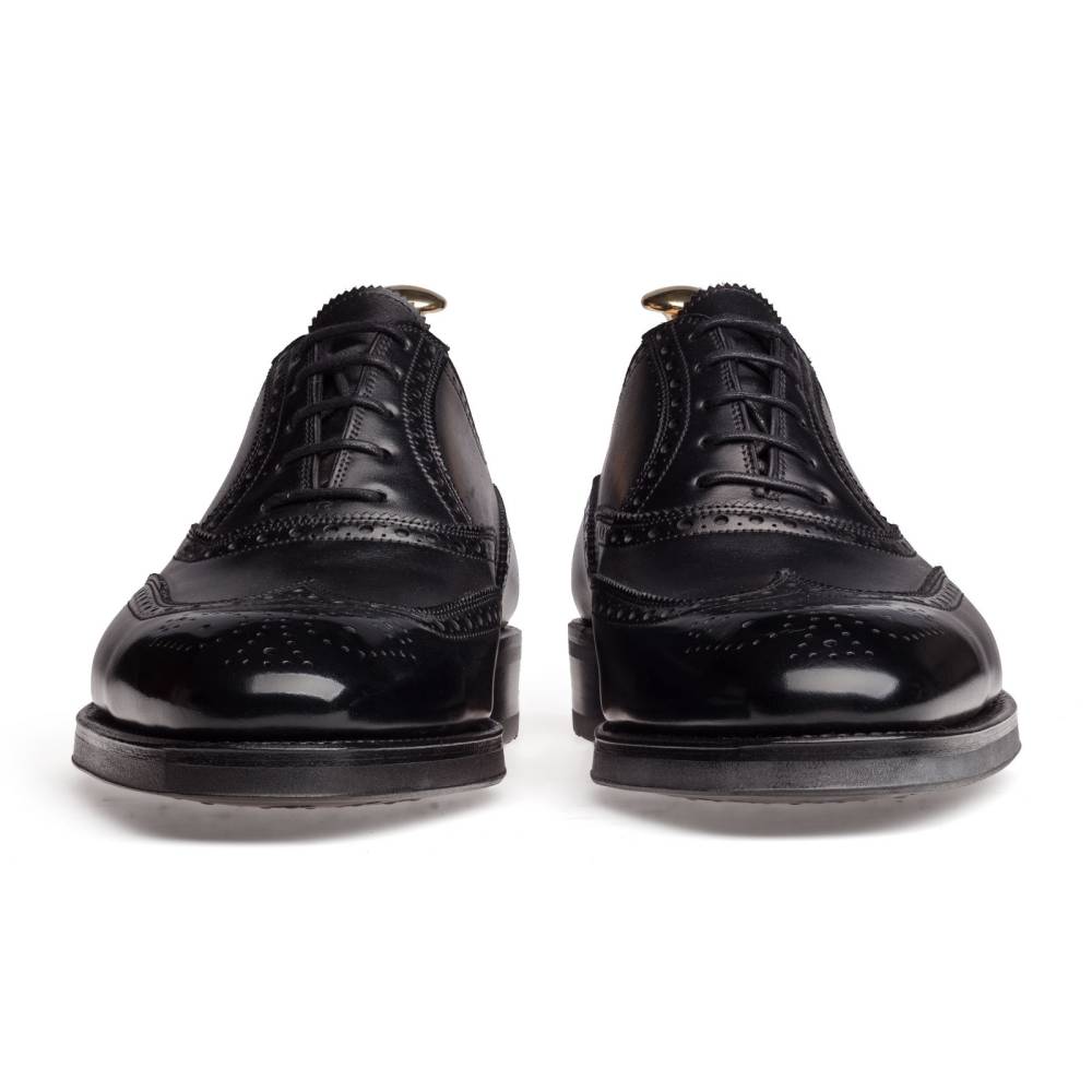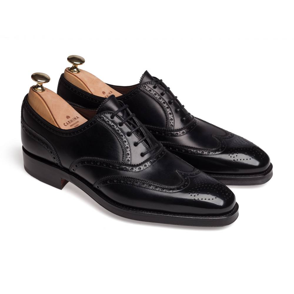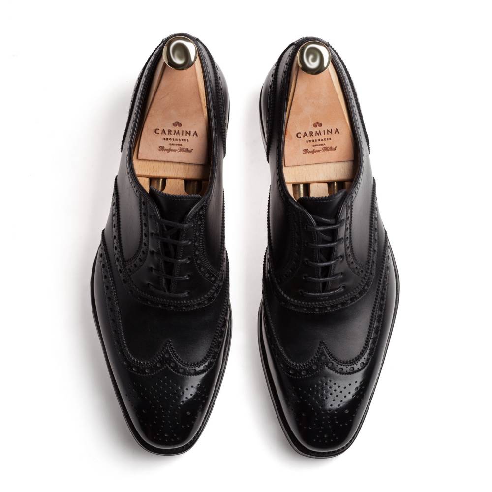 Оксфорды броги Carmina из плотной телячьей кожи чёрного цвета. Внутренняя отделка из тонкой кожи. Верхний слой подошвы выполнен из кожи, а нижний из прочной резины. Туфли украшены традиционным перфорированным узором и медальоном на мысе. Конструкция Goodyear.