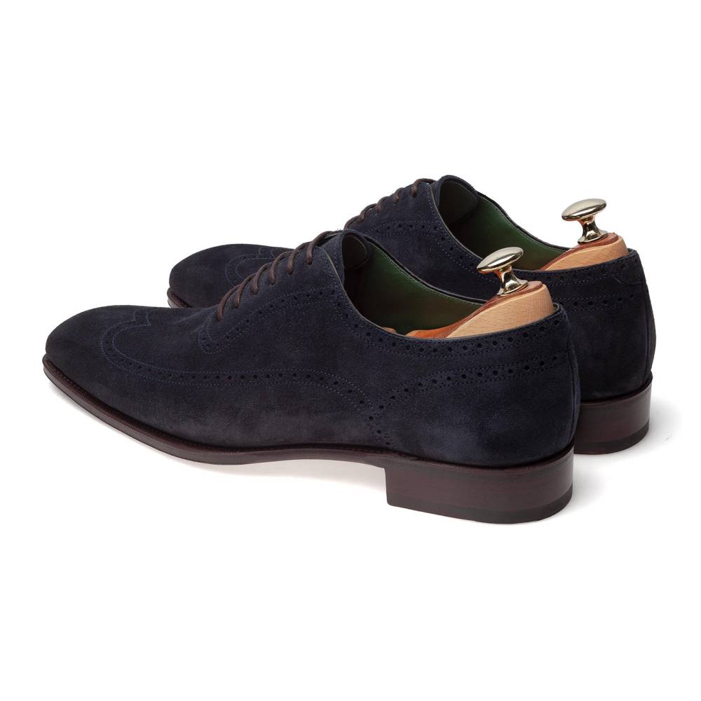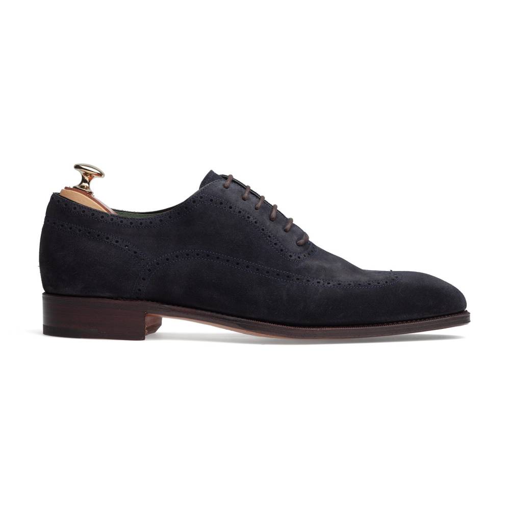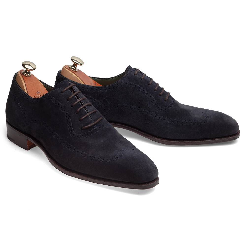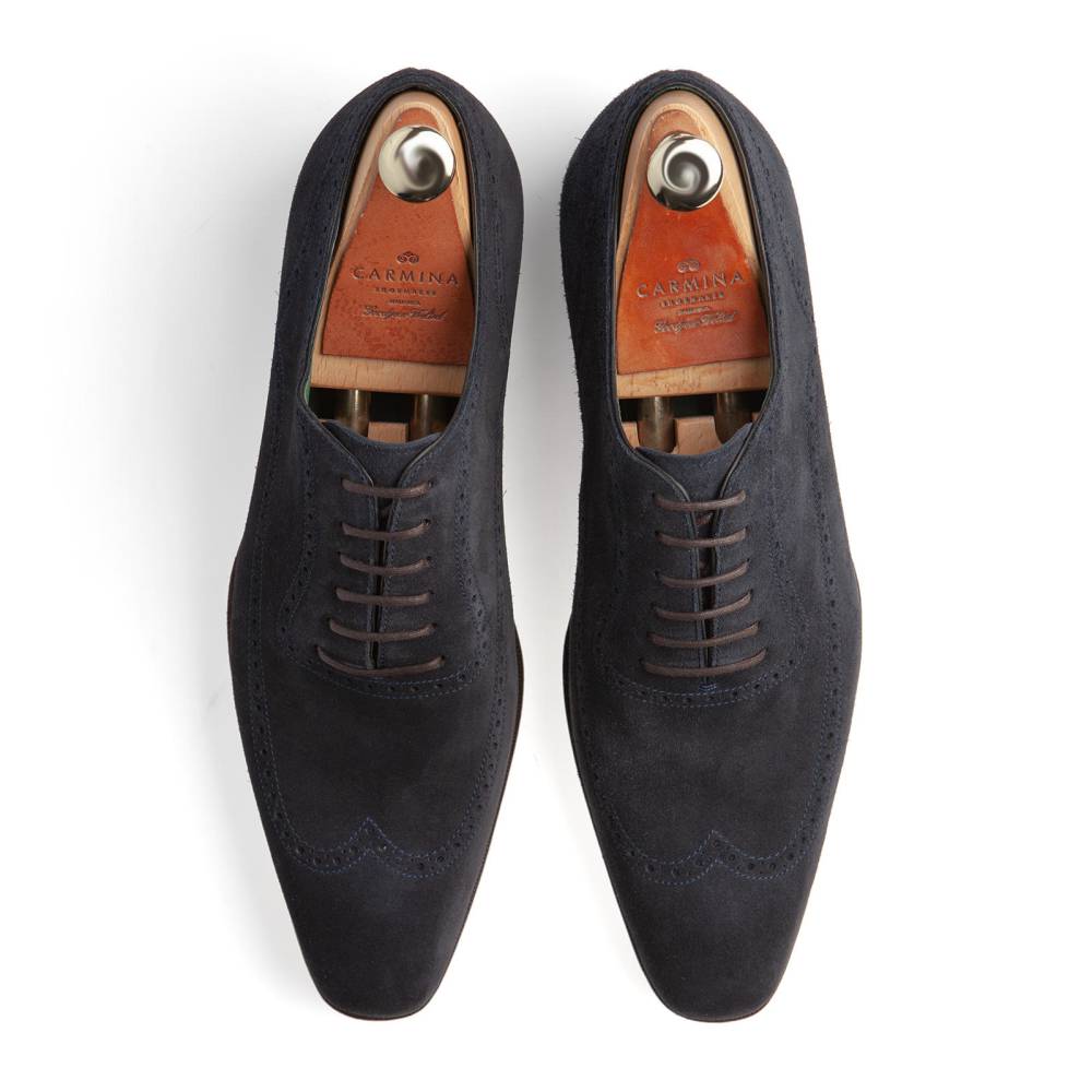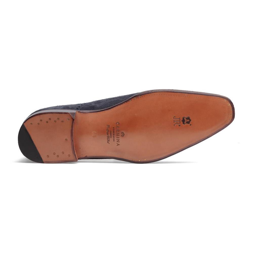 Элегантные мужские оксфорды Carmina выполнены из цельного отрезка мягкой бархатистой замши тёмно-синего цвета. Верх украшен традиционным узором «брог», имитирующим конструктивные линии. Внутренняя отделка из гладкой телячьей кожи тёмно-зеленого цвета. Кожаная подошва JR. Конструкция Goodyear Welted.