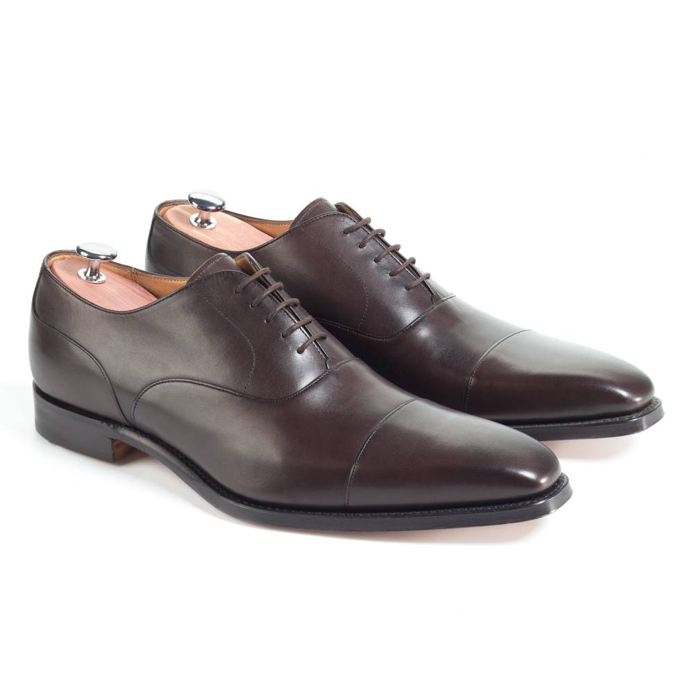 Традиционные оксфорды с отрезным мысом (Cap Toe Oxfords) Cheaney Warwick на кожаной подошве. Верхняя часть полностью выполнена из плотной телячьей кожи тёмно-коричневого цвета. Средняя полнота. Конструкция Goodyear.