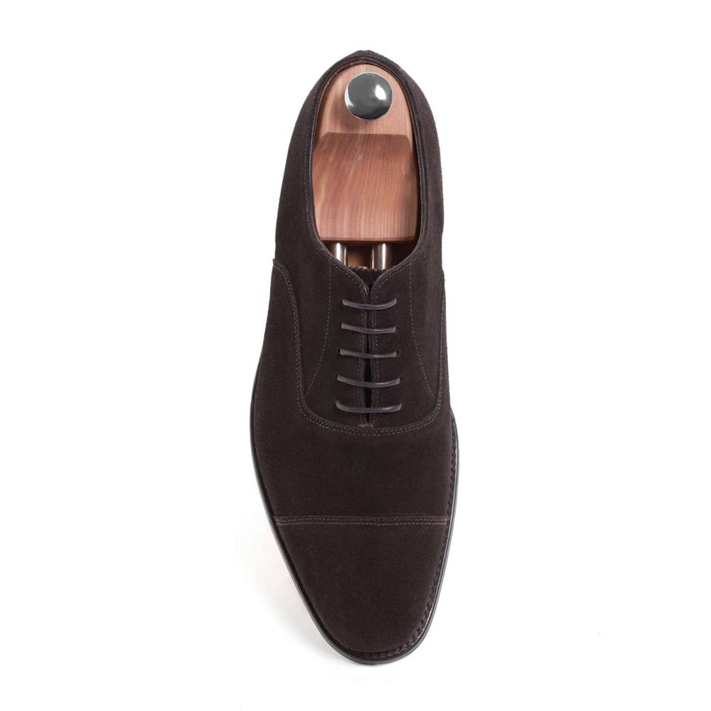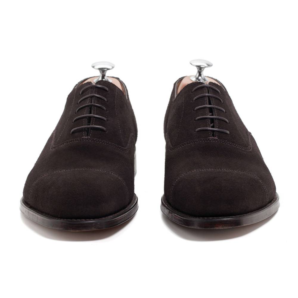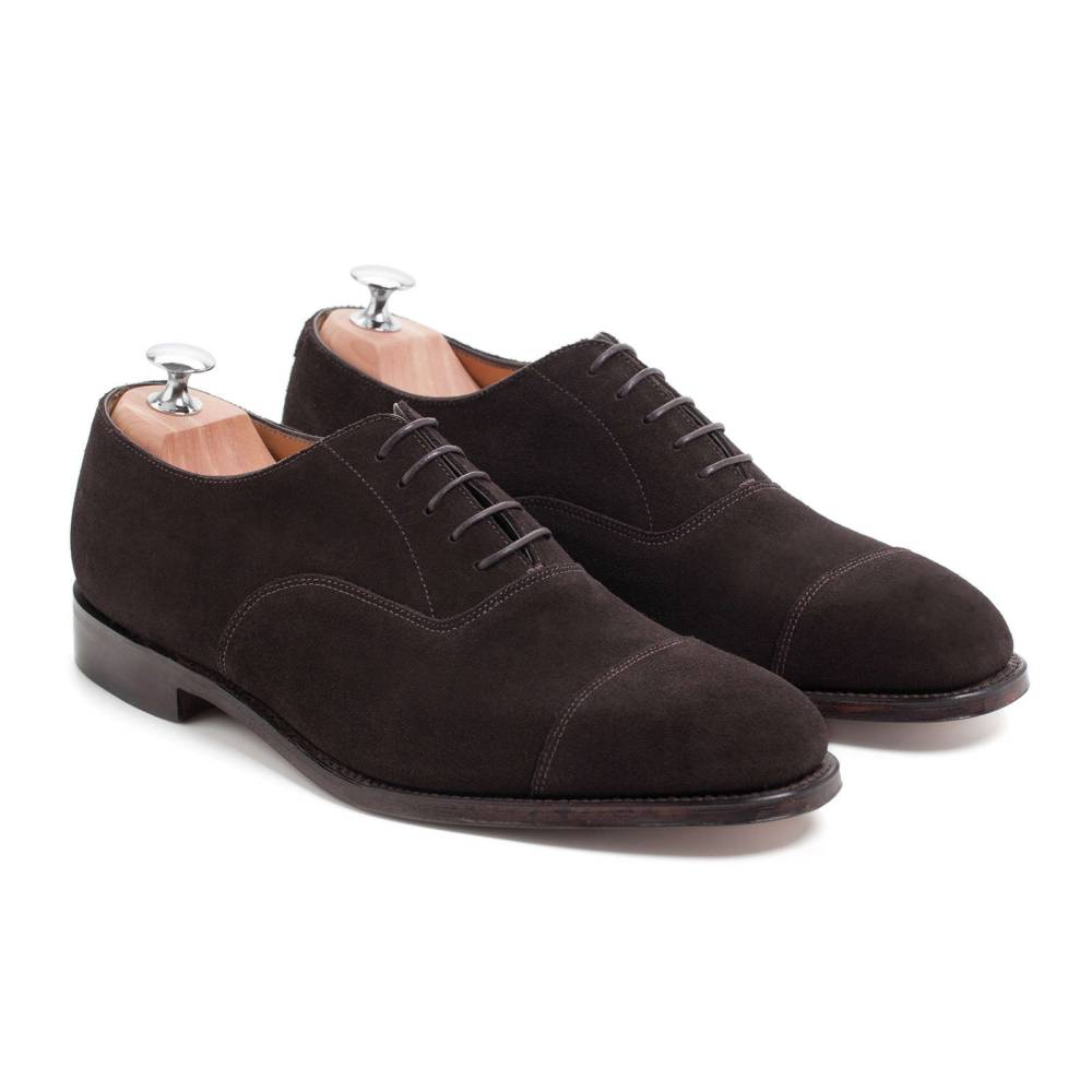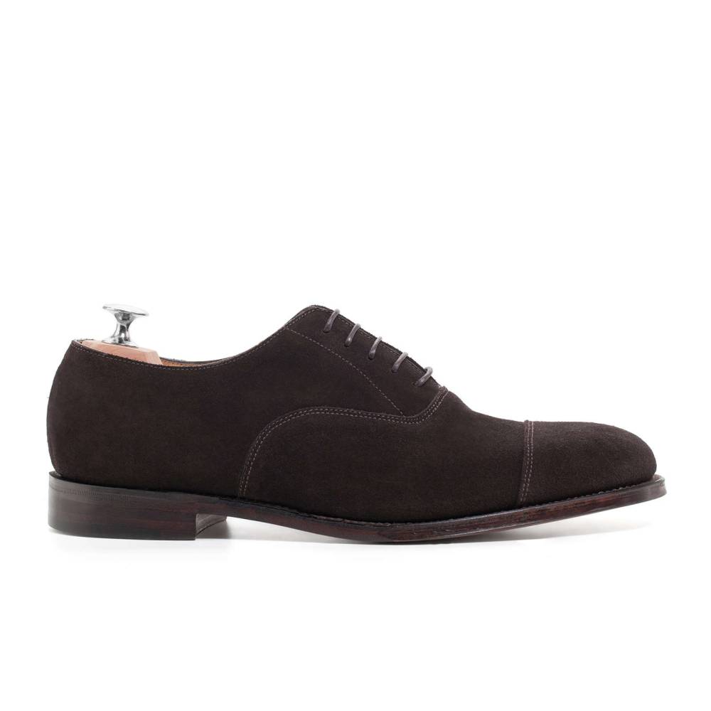 Тёмно-коричневые замшевые оксфорды Loake из флагманской коллекции Loake 1880 на кожаной подошве. С внутренней стороны отделка из телячьей кожи. Средняя полнота. Конструкция Goodyear.