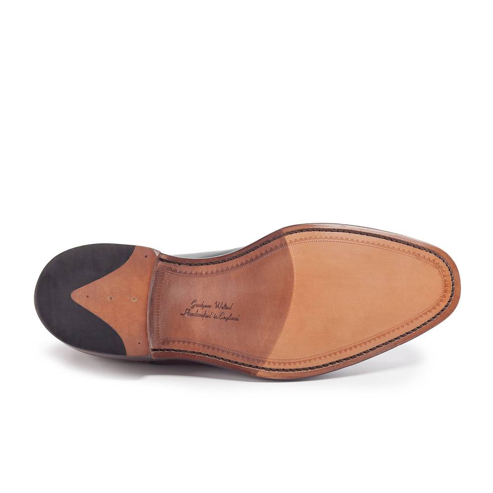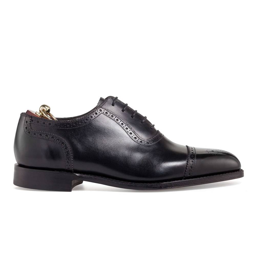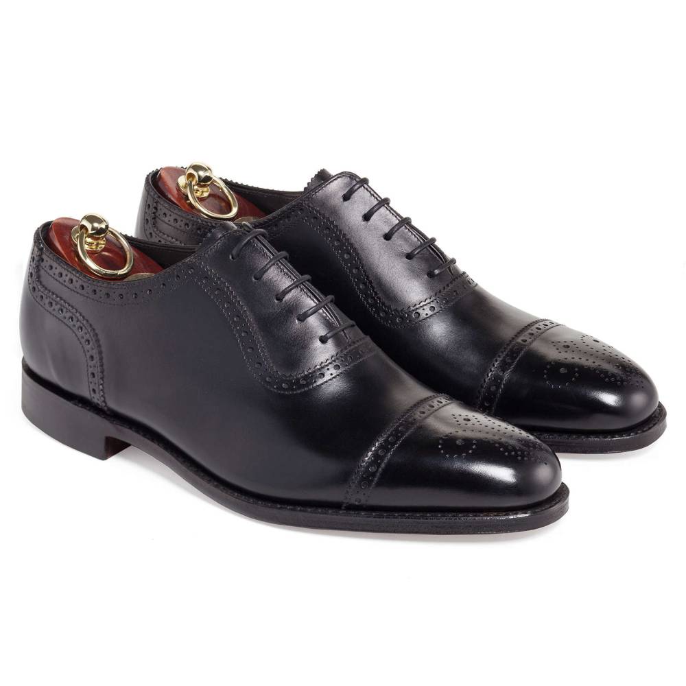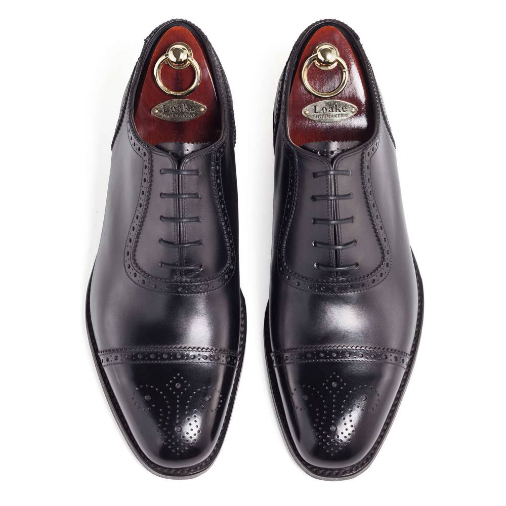 Полуброги Loake Strand из коллекции Loake 1880 на кожаной подошве. Верхняя часть выполнена из гладкой телячьей кожи чёрного цвета. Внутренняя отделка из тонкой кожи. Туфли украшены традиционным перфорированным узором и медальоном на мысе. Конструкция Goodyear.