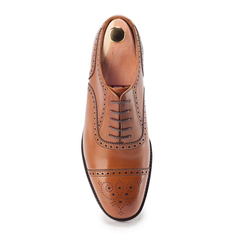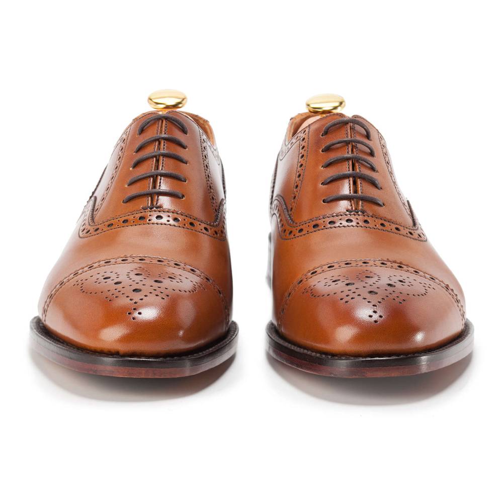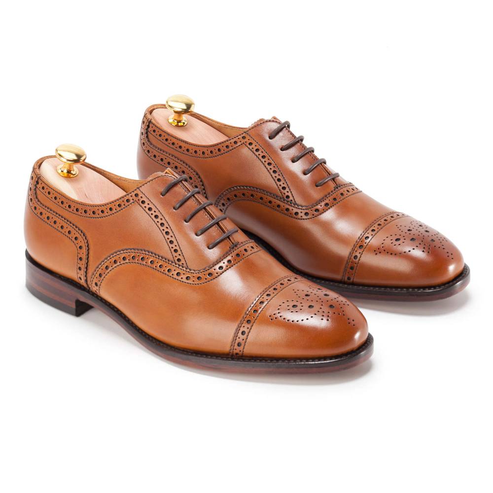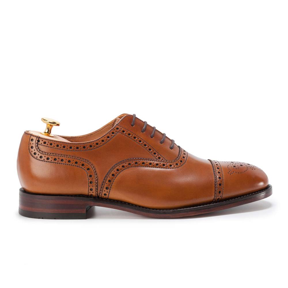 Оксфорды полуброги Loake Tweed из коллекции Loake Shoemakers выполнены из плотной телячьей кожи светло-коричневого цвета. Внутренняя отделка из тонкой кожи. Кожаная подошва со вставкой из резины. Туфли украшены традиционным перфорированным узором и медальоном на мысе. Конструкция Goodyear.