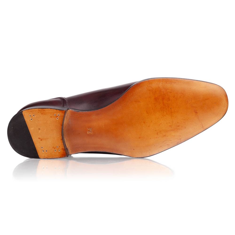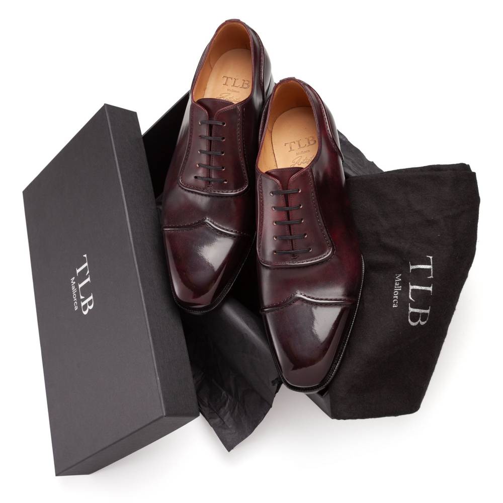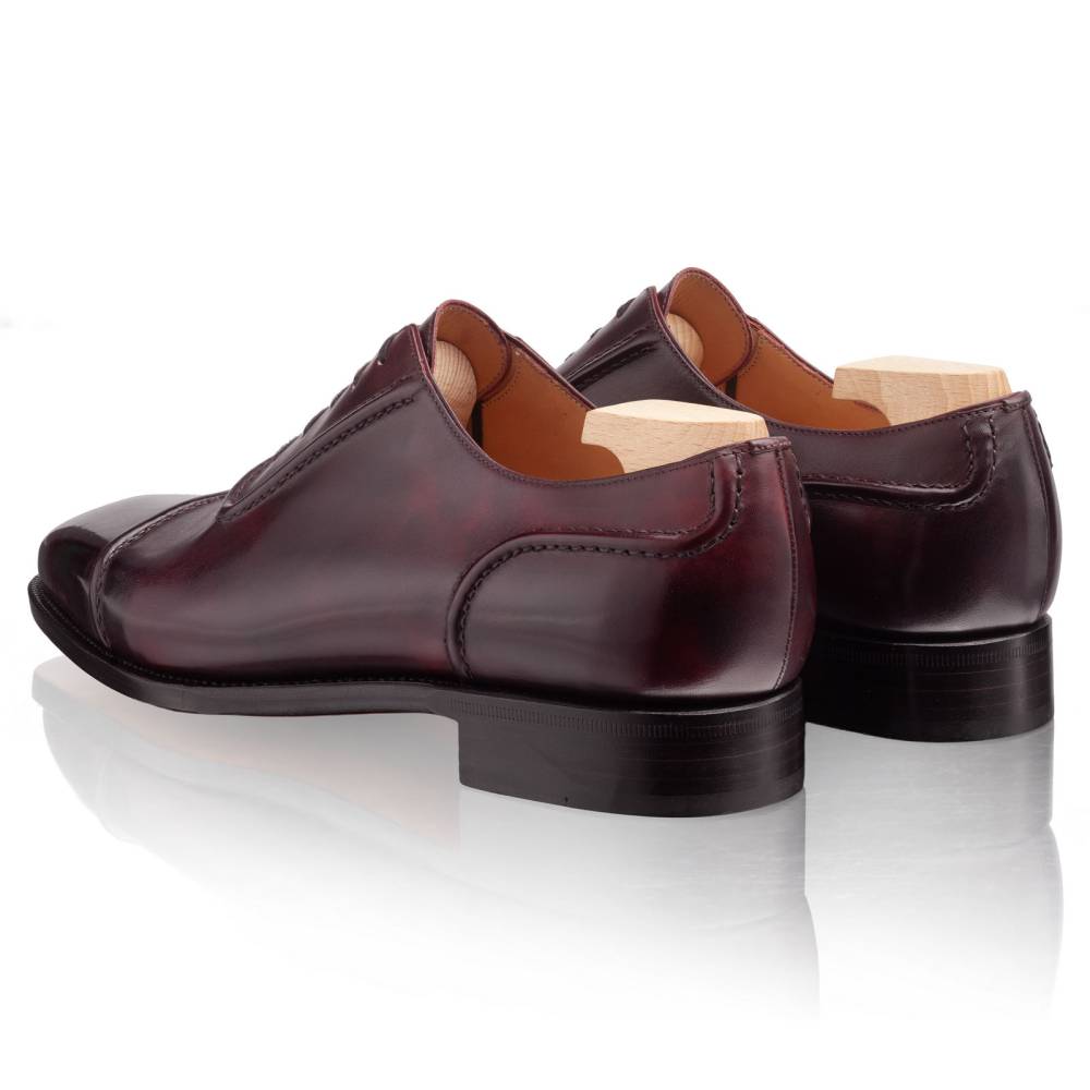 Мужские оксфорды-аделаиды премиальной линейки Artista. Верх из цельной высококачественной телячьей кожи «museum calf» бордового цвета с игрой цвета, схожой с узорами на мраморе. Рельеф создан с помощью сложной сборки и прошивки кожи. U-образная вставка вокруг шнуровки, пикообразный мысок (Peak toe) и шов на заднике сформированы фактурным швом с кожаным кантом (Piped seams). Объемный декор на цельном куске кожи делает модель менее формальной (semi-formal). Внутренняя отделка из телячьей кожи растительного дубления. Одиночная кожаная подошва с закрытым швом, делает пару более утончённой и целостной. Конструкция Goodyear Welted.