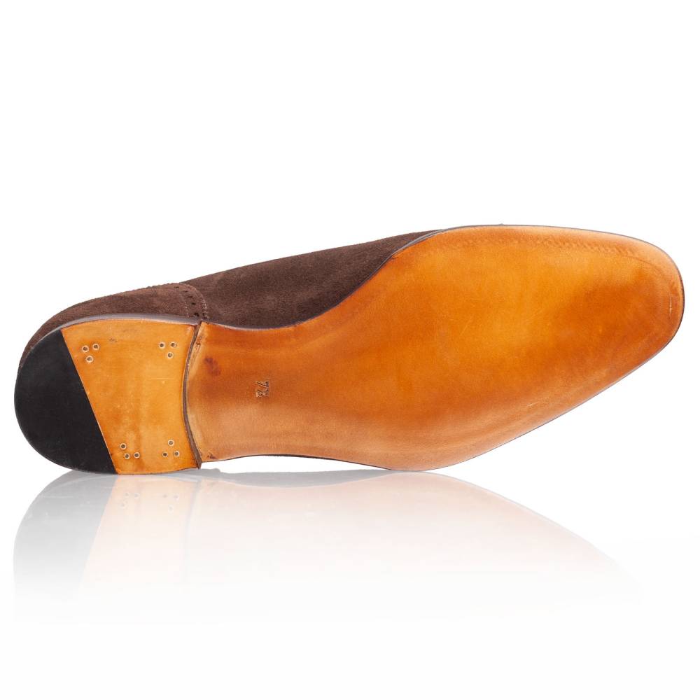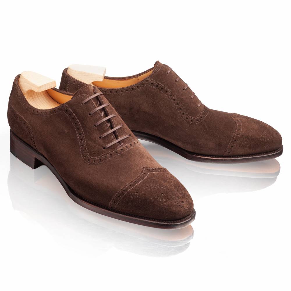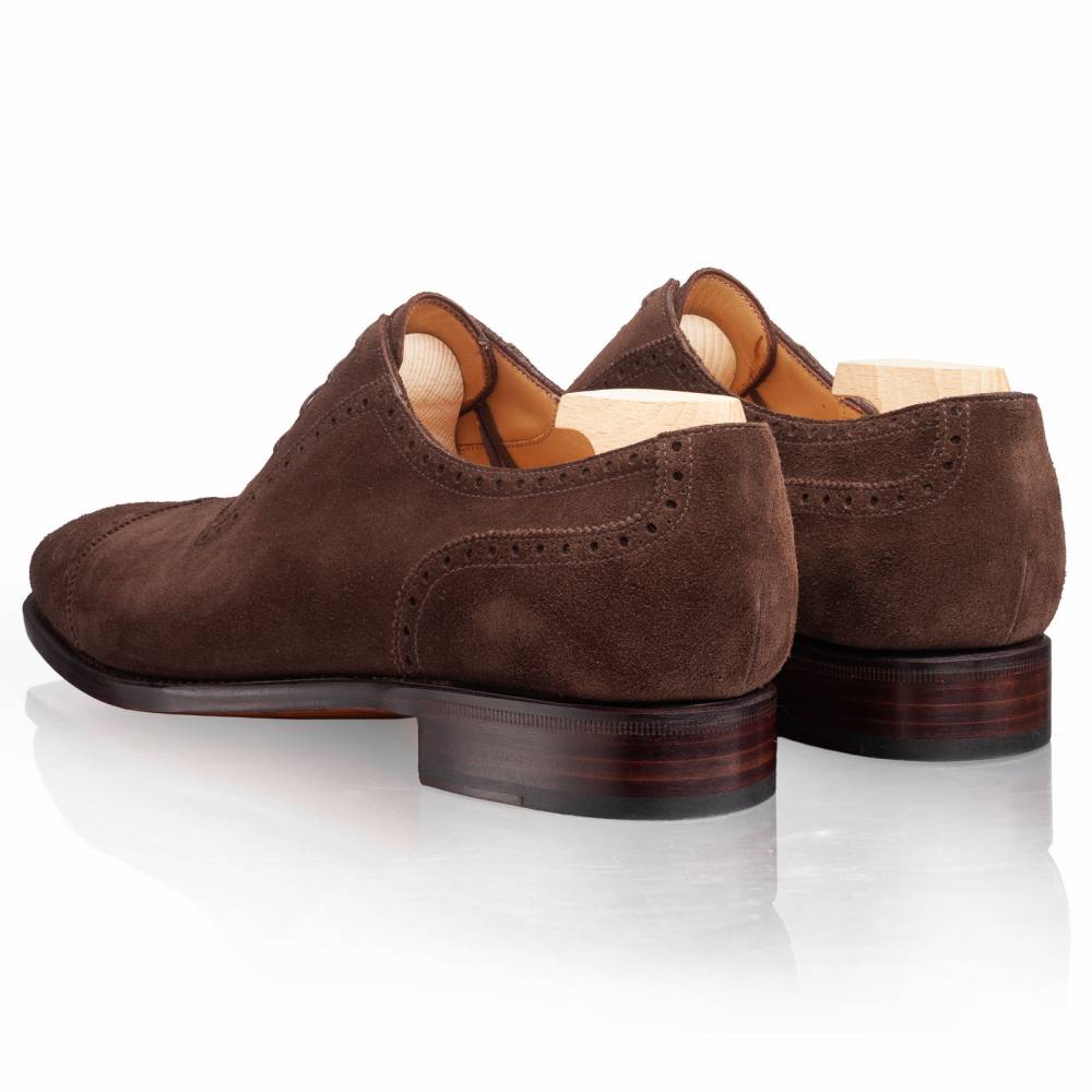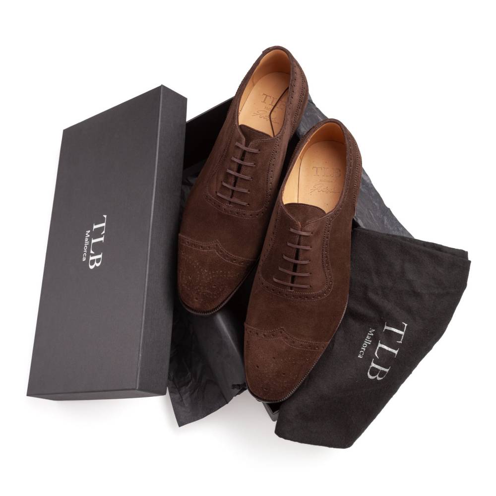 Неформальные мужские оксфорды-аделаиды из коллекции TLB Artista с фигурным отрезным мыском. Такой тип оксфордов отличается подчёркнутой U-образной формой вокруг шнуровки. Верх выполнен из высококачественной бархатистой замши тёмно-коричневого цвета, поставляемой английской дубильней Charles F. Stead. Подкладка и стелька — из тонкой телячьей кожи растительного дубления. Подошва — кожаная, с закрытым швом, что делает пару более утончённой и целостной. Конструкция Goodyear Welted.