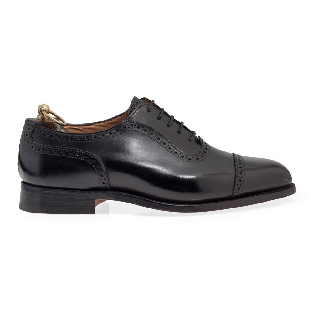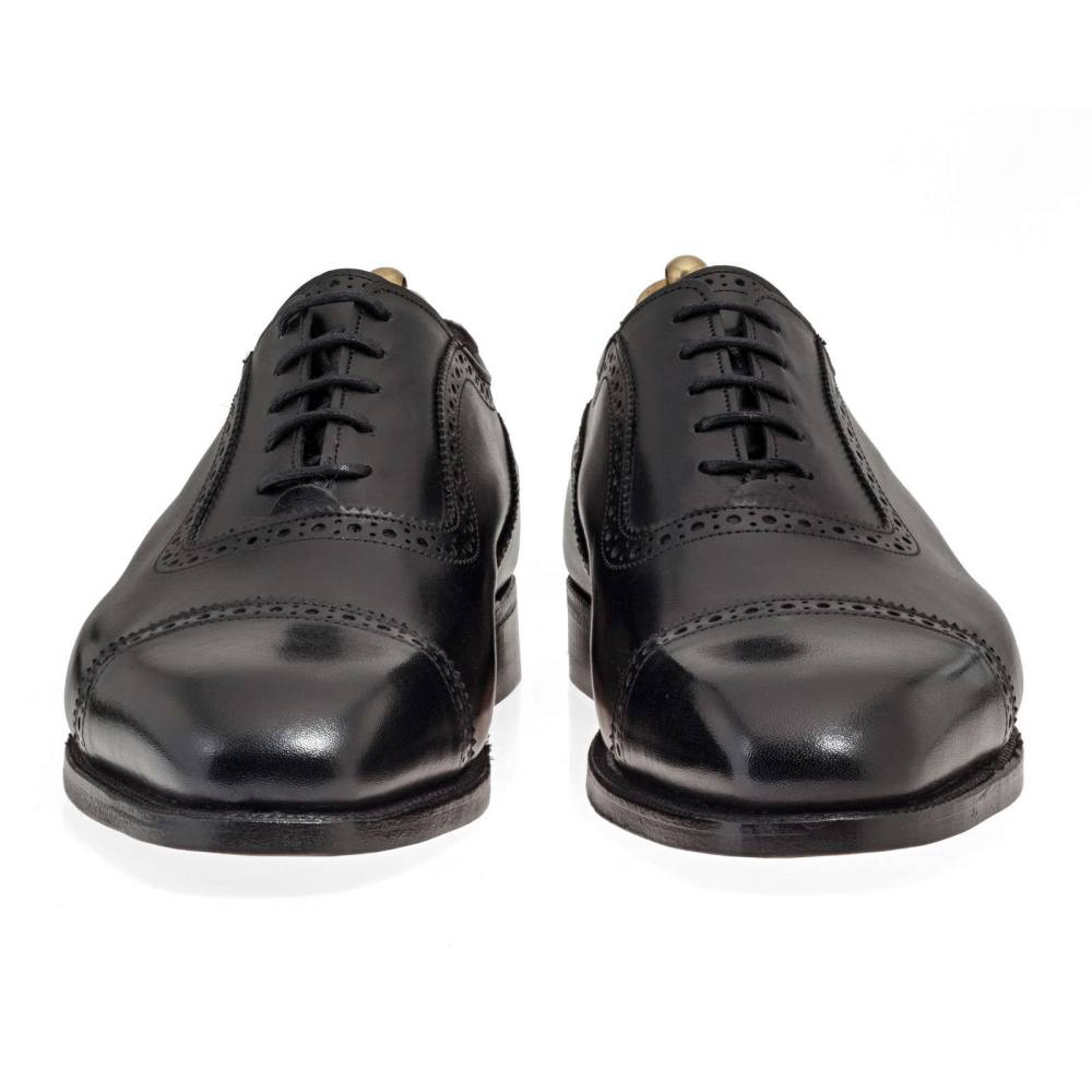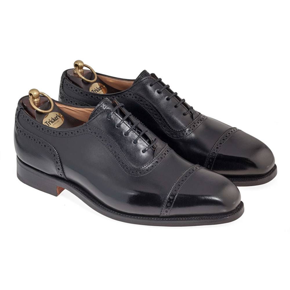 Оксфорды полуброги Belgrave с отрезным мысом из коллекции Tricker's 1829 Collection являются примером нестареющей английской классики. Модель выполнена из плотной телячьей кожи чёрного цвета. Внутренняя отделка из кожи. Туфли украшены традиционным перфорированным узором. Особенностью данной колодки являются заметные боковые грани, из-за чего обувь приобретает формальный и консервативный внешний вид. Кожаная подошва. Конструкция Goodyear Welted.