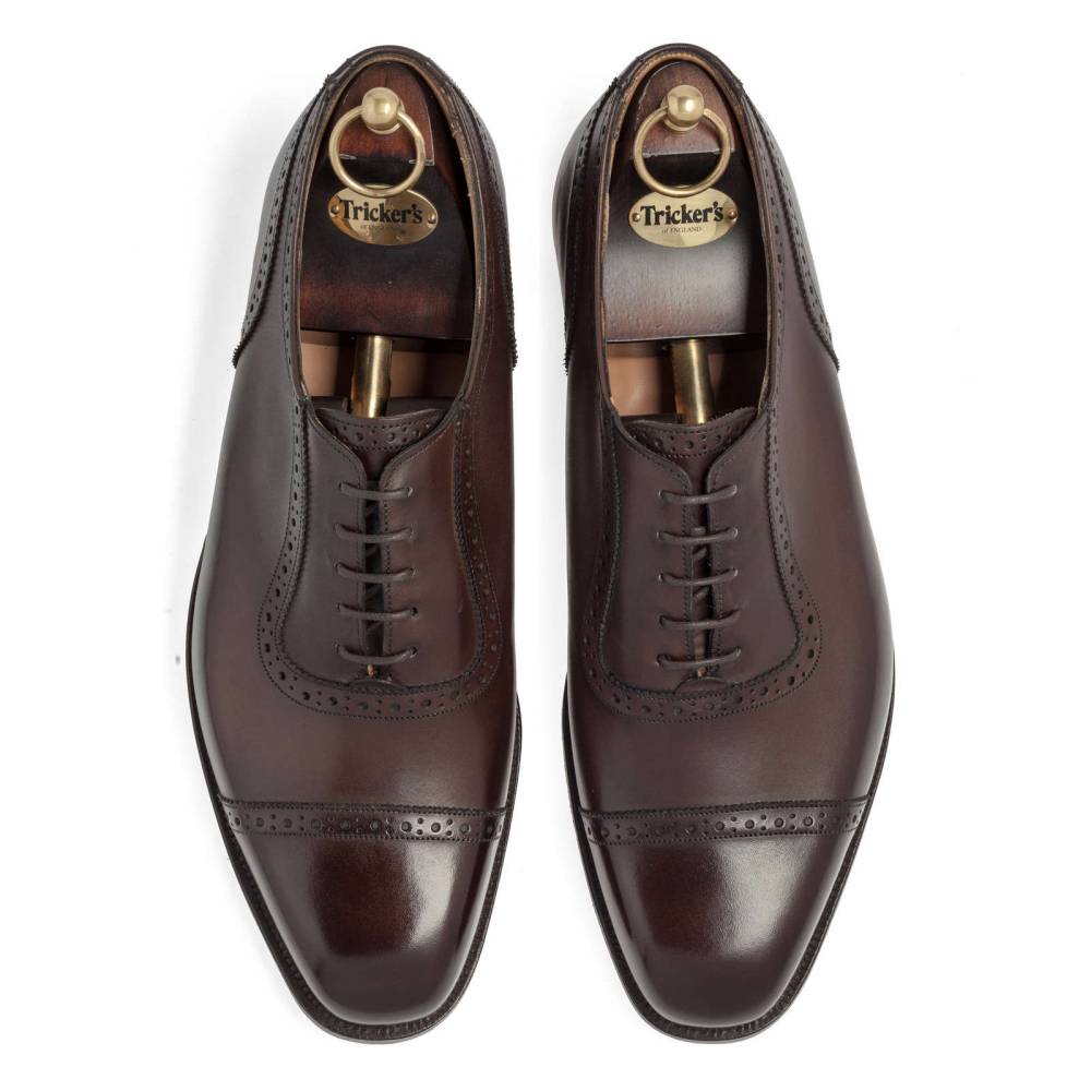 Оксфорды полуброги Belgrave с отрезным мысом из коллекции Tricker's 1829 Collection являются примером нестареющей английской классики. Модель выполнена из плотной телячьей кожи тёмно-коричневого цвета. Внутренняя отделка из кожи. Туфли украшены традиционным перфорированным узором. Особенностью данной колодки являются заметные боковые грани, из-за чего обувь приобретает формальный и консервативный внешний вид. Кожаная подошва. Конструкция Goodyear Welted.
